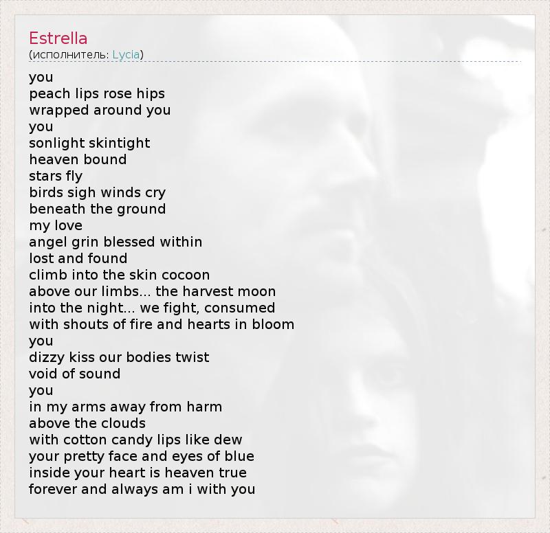 you peach lips rose hips wrapped around you you sonlight skintight heaven bound stars fly birds sigh winds cry beneath the ground my love angel grin blessed within lost and found climb into the skin cocoon above our limbs... the harvest moon into the night... we fight, consumed with shouts of fire and hearts in bloom you dizzy kiss our bodies twist void of sound you in my arms away from harm above the clouds with cotton candy lips like dew your pretty face and eyes of blue inside your heart is heaven true forever and always am i with you