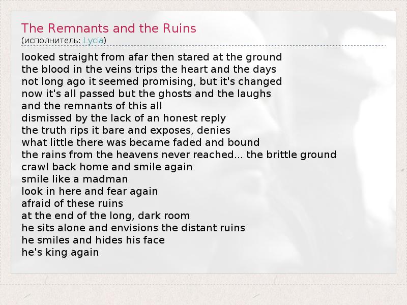 А как ты думаешь, о чем песня "The Remnants and the Ruins" ?