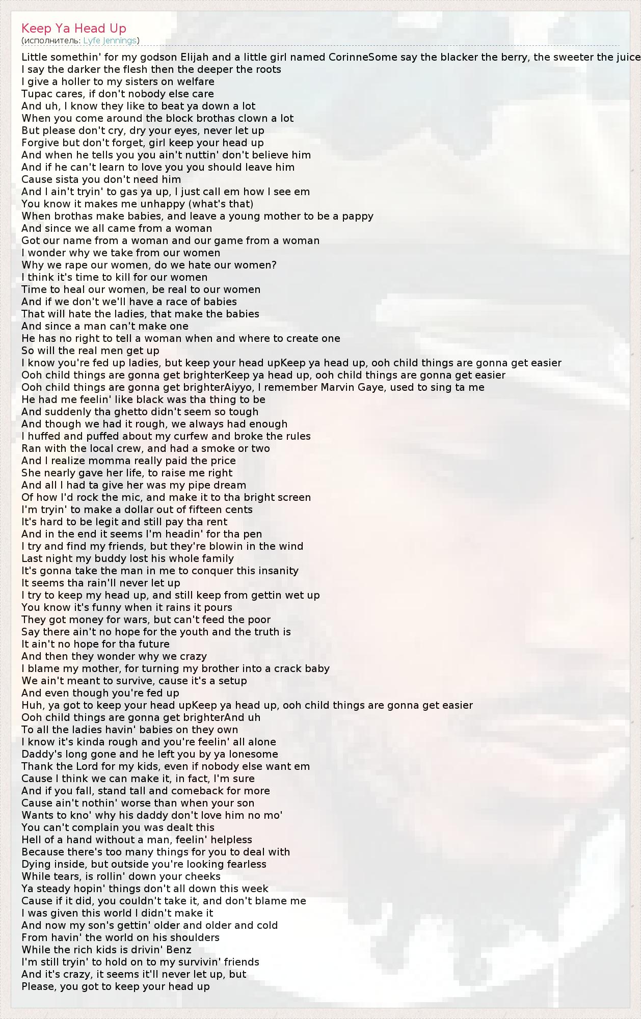 Little somethin' for my godson Elijah and a little girl named CorinneSome say the blacker the berry, the sweeter the juice I say the darker the flesh then the deeper the roots I give a holler to my sisters on welfare Tupac cares, if don't nobody else care And uh, I know they like to beat ya down a lot When you come around the block brothas clown a lot But please don't cry, dry your eyes, never let up Forgive but don't forget, girl keep your head up And when he tells you you ain't nuttin' don't believe him And if he can't learn to love you you should leave him Cause sista you don't need him And I ain't tryin' to gas ya up, I just call em how I see em You know it makes me unhappy (what's that) When brothas make babies, and leave a young mother to be a pappy And since we all came from a woman Got our name from a woman and our game from a woman I wonder why we take from our women Why we rape our women, do we hate our women? I think it's time to kill for our women Time to heal our women, be real to our women And if we don't we'll have a race of babies That will hate the ladies, that make the babies And since a man can't make one He has no right to tell a woman when and where to create one So will the real men get up I know you're fed up ladies, but keep your head upKeep ya head up, ooh child things are gonna get easier Ooh child things are gonna get brighterKeep ya head up, ooh child things are gonna get easier Ooh child things are gonna get brighterAiyyo, I remember Marvin Gaye, used to sing ta me He had me feelin' like black was tha thing to be And suddenly tha ghetto didn't seem so tough And though we had it rough, we always had enough I huffed and puffed about my curfew and broke the rules Ran with the local crew, and had a smoke or two And I realize momma really paid the price She nearly gave her life, to raise me right And all I had ta give her was my pipe dream Of how I'd rock the mic, and make it to tha bright screen I'm tryin' to make a dollar out of fifteen cents It's hard to be legit and still pay tha rent And in the end it seems I'm headin' for tha pen I try and find my friends, but they're blowin in the wind Last night my buddy lost his whole family It's gonna take the man in me to conquer this insanity It seems tha rain'll never let up I try to keep my head up, and still keep from gettin wet up You know it's funny when it rains it pours They got money for wars, but can't feed the poor Say there ain't no hope for the youth and the truth is It ain't no hope for tha future And then they wonder why we crazy I blame my mother, for turning my brother into a crack baby We ain't meant to survive, cause it's a setup And even though you're fed up Huh, ya got to keep your head upKeep ya head up, ooh child things are gonna get easier Ooh child things are gonna get brighterAnd uh To all the ladies havin' babies on they own I know it's kinda rough and you're feelin' all alone Daddy's long gone and he left you by ya lonesome Thank the Lord for my kids, even if nobody else want em Cause I think we can make it, in fact, I'm sure And if you fall, stand tall and comeback for more Cause ain't nothin' worse than when your son Wants to kno' why his daddy don't love him no mo' You can't complain you was dealt this Hell of a hand without a man, feelin' helpless Because there's too many things for you to deal with Dying inside, but outside you're looking fearless While tears, is rollin' down your cheeks Ya steady hopin' things don't all down this week Cause if it did, you couldn't take it, and don't blame me I was given this world I didn't make it And now my son's gettin' older and older and cold From havin' the world on his shoulders While the rich kids is drivin' Benz I'm still tryin' to hold on to my survivin' friends And it's crazy, it seems it'll never let up, but Please, you got to keep your head up