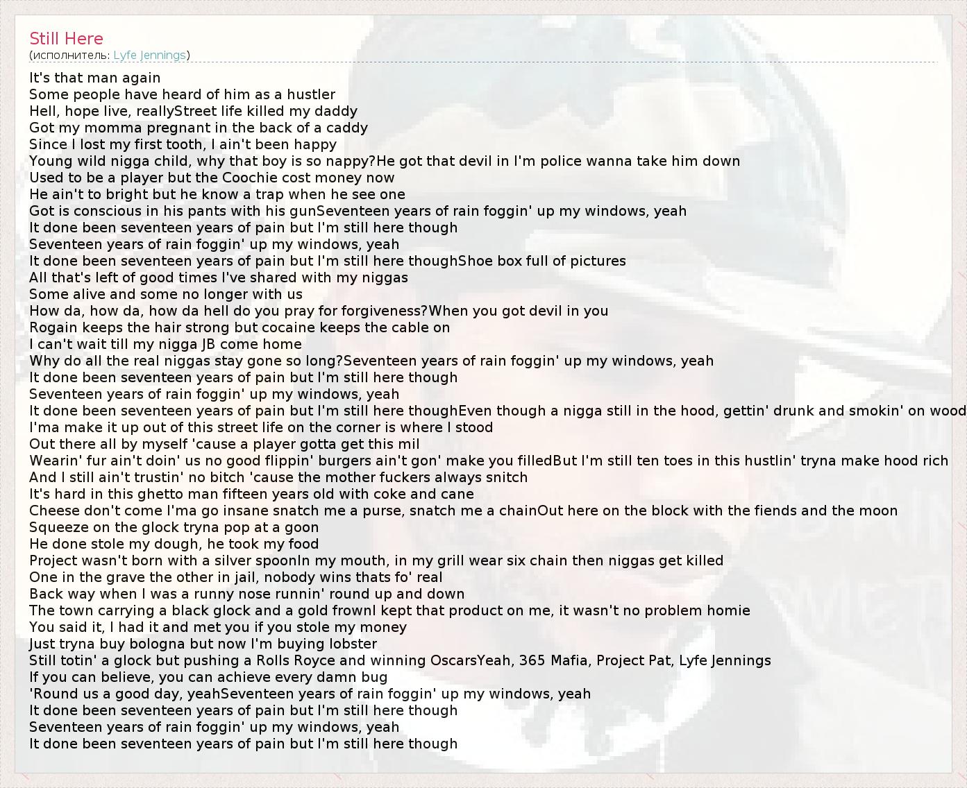 It done been seventeen years of pain but I'm still here thoughEven though a nigga still in the hood, gettin' drunk and smokin' on wood