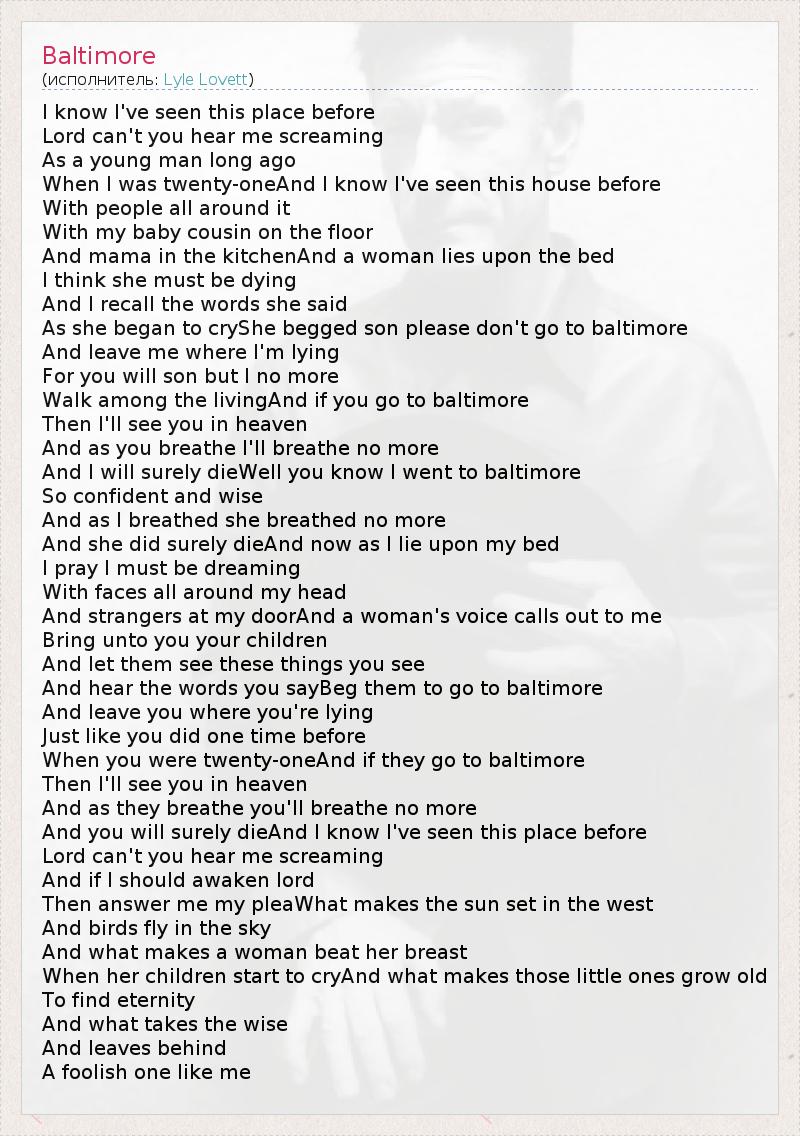 I know I've seen this place before Lord can't you hear me screaming As a young man long ago When I was twenty-oneAnd I know I've seen this house before With people all around it With my baby cousin on the floor And mama in the kitchenAnd a woman lies upon the bed I think she must be dying And I recall the words she said As she began to cryShe begged son please don't go to baltimore And leave me where I'm lying For you will son but I no more Walk among the livingAnd if you go to baltimore Then I'll see you in heaven And as you breathe I'll breathe no more And I will surely dieWell you know I went to baltimore So confident and wise And as I breathed she breathed no more And she did surely dieAnd now as I lie upon my bed I pray I must be dreaming With faces all around my head And strangers at my doorAnd a woman's voice calls out to me Bring unto you your children And let them see these things you see And hear the words you sayBeg them to go to baltimore And leave you where you're lying Just like you did one time before When you were twenty-oneAnd if they go to baltimore Then I'll see you in heaven And as they breathe you'll breathe no more And you will surely dieAnd I know I've seen this place before Lord can't you hear me screaming And if I should awaken lord Then answer me my pleaWhat makes the sun set in the west And birds fly in the sky And what makes a woman beat her breast When her children start to cryAnd what makes those little ones grow old To find eternity And what takes the wise And leaves behind A foolish one like me
