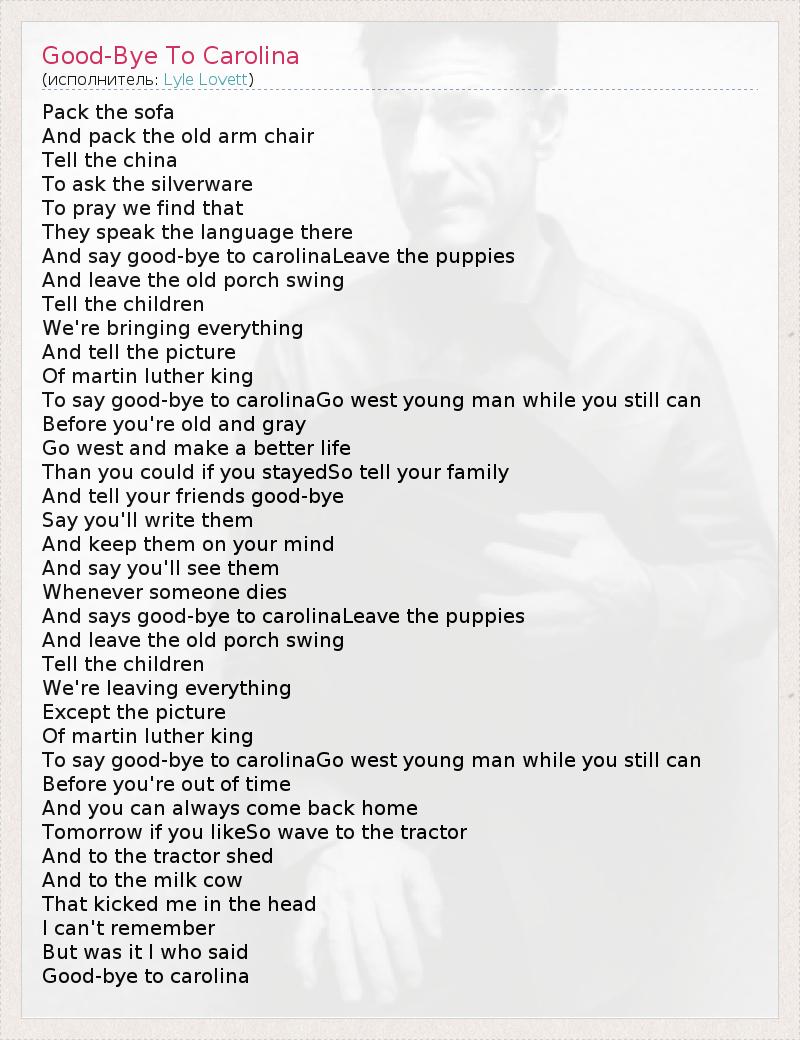 Pack the sofa And pack the old arm chair Tell the china To ask the silverware To pray we find that They speak the language there And say good-bye to carolinaLeave the puppies And leave the old porch swing Tell the children We're bringing everything And tell the picture Of martin luther king To say good-bye to carolinaGo west young man while you still can Before you're old and gray Go west and make a better life Than you could if you stayedSo tell your family And tell your friends good-bye Say you'll write them And keep them on your mind And say you'll see them Whenever someone dies And says good-bye to carolinaLeave the puppies And leave the old porch swing Tell the children We're leaving everything Except the picture Of martin luther king To say good-bye to carolinaGo west young man while you still can Before you're out of time And you can always come back home Tomorrow if you likeSo wave to the tractor And to the tractor shed And to the milk cow That kicked me in the head I can't remember But was it I who said Good-bye to carolina