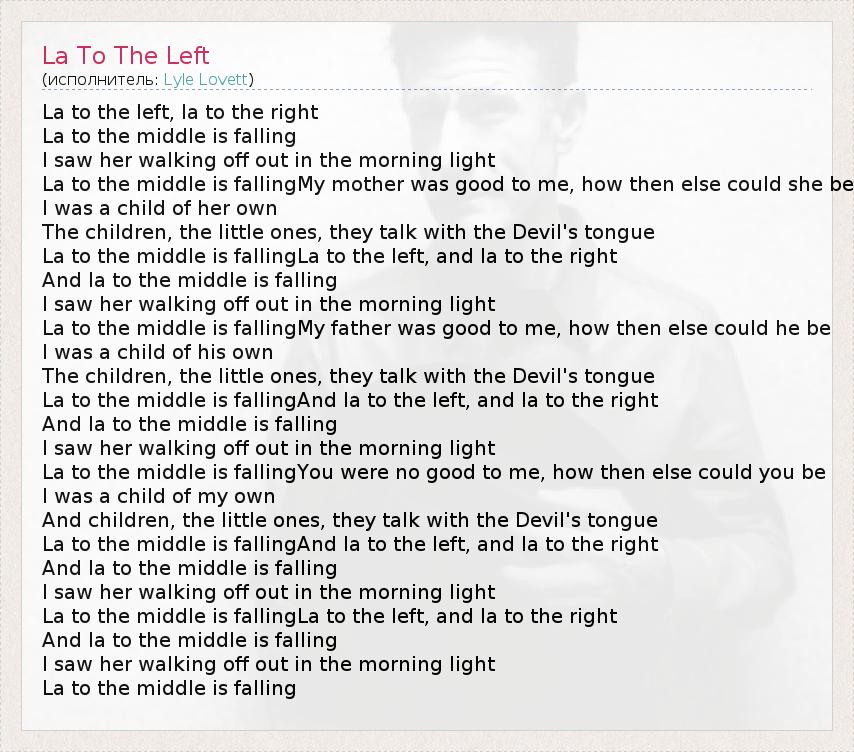 Это интересно:Лайл Ловетт (англ. Lyle Pearce Lovett; родился 1 ноября 1957) — американский кантри-певец, автор песен и актёр. Записал 13 альбомов и 21 сингл. Сингл «Cowboy Man» занял 10 позицию в U.S. Billboard Hot Country Songs chart в 1986 году. Ловетт — обладатель четырех наград «Грэмми». В 2007 году он выпустил альбом «It’s Not Big It’s Large», который стал вторым в рейтинге Top Country Albums. Последний альбом «Natural Forces» вышел 20 октября 2009 года.Ловетт... продолжение