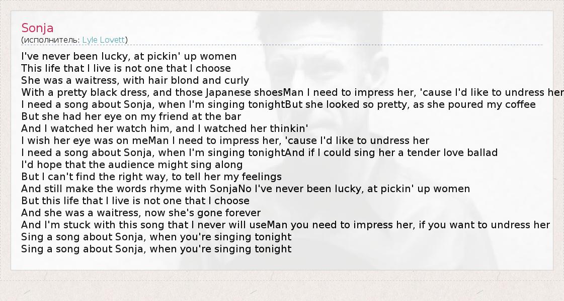 I've never been lucky, at pickin' up women This life that I live is not one that I choose She was a waitress, with hair blond and curly With a pretty black dress, and those Japanese shoesMan I need to impress her, 'cause I'd like to undress her I need a song about Sonja, when I'm singing tonightBut she looked so pretty, as she poured my coffee But she had her eye on my friend at the bar And I watched her watch him, and I watched her thinkin' I wish her eye was on meMan I need to impress her, 'cause I'd like to undress her I need a song about Sonja, when I'm singing tonightAnd if I could sing her a tender love ballad I'd hope that the audience might sing along But I can't find the right way, to tell her my feelings And still make the words rhyme with SonjaNo I've never been lucky, at pickin' up women But this life that I live is not one that I choose And she was a waitress, now she's gone forever And I'm stuck with this song that I never will useMan you need to impress her, if you want to undress her Sing a song about Sonja, when you're singing tonight Sing a song about Sonja, when you're singing tonight