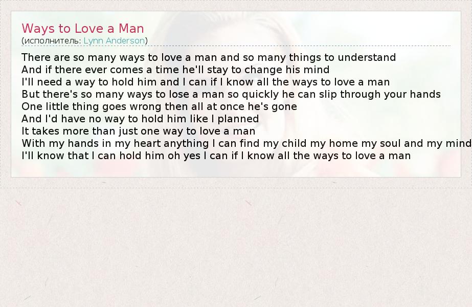 There are so many ways to love a man and so many things to understand And if there ever comes a time he'll stay to change his mind I'll need a way to hold him and I can if I know all the ways to love a man But there's so many ways to lose a man so quickly he can slip through your hands One little thing goes wrong then all at once he's gone And I'd have no way to hold him like I planned It takes more than just one way to love a man With my hands in my heart anything I can find my child my home my soul and my mind I'll know that I can hold him oh yes I can if I know all the ways to love a man