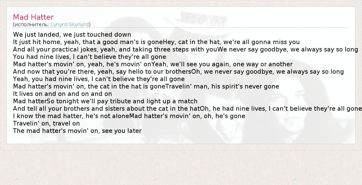 We just landed, we just touched down It just hit home, yeah, that a good man's is goneHey, cat in the hat, we're all gonna miss you And all your practical jokes, yeah, and taking three steps with youWe never say goodbye, we always say so long You had nine lives, I can't believe they're all gone Mad hatter's movin' on, yeah, he's movin' onYeah, we'll see you again, one way or another And now that you're there, yeah, say hello to our brothersOh, we never say goodbye, we always say so long Yeah, you had nine lives, I can't believe they're all gone Mad hatter's movin' on, the cat in the hat is goneTravelin' man, his spirit's never gone It lives on and on and on and on Mad hatterSo tonight we'll pay tribute and light up a match And tell all your brothers and sisters about the cat in the hatOh, he had nine lives, I can't believe they're all gone I know the mad hatter, he's not aloneMad hatter's movin' on, oh, he's gone Travelin' on, travel on The mad hatter's movin' on, see you later