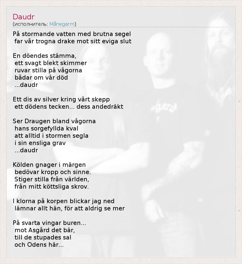 På stormande vatten med brutna segel far vår trogna drake mot sitt eviga slut En döendes stämma, ett svagt blekt skimmer ruvar stilla på vågorna bådar om vår död ...daudr Ett dis av silver kring vårt skepp ett dödens tecken... dess andedräkt Ser Draugen bland vågorna hans sorgefyllda kval att alltid i stormen segla i sin ensliga grav ...daudr Kölden gnager i märgen bedövar kropp och sinne. Stiger stilla från världen, från mitt köttsliga skrov. I klorna på korpen blickar jag ned lämnar allt hän, för att aldrig se mer På svarta vingar buren... mot Asgård det bär, till de stupades sal och Odens här...