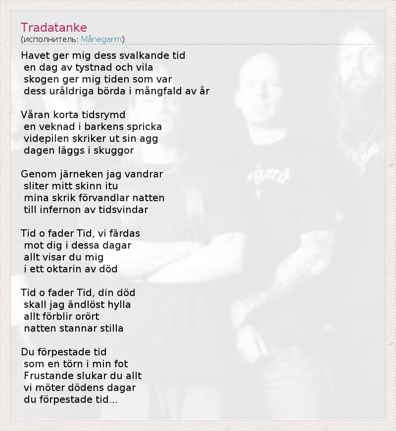 Havet ger mig dess svalkande tid en dag av tystnad och vila skogen ger mig tiden som var dess uråldriga börda i mångfald av år Våran korta tidsrymd en veknad i barkens spricka videpilen skriker ut sin agg dagen läggs i skuggor Genom järneken jag vandrar sliter mitt skinn itu mina skrik förvandlar natten till infernon av tidsvindar Tid o fader Tid, vi färdas mot dig i dessa dagar allt visar du mig i ett oktarin av död Tid o fader Tid, din död skall jag ändlöst hylla allt förblir orört natten stannar stilla Du förpestade tid som en törn i min fot Frustande slukar du allt vi möter dödens dagar du förpestade tid...