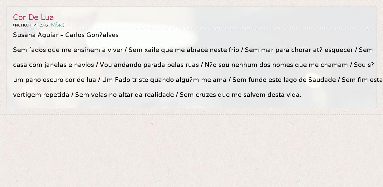 Susana Aguiar – Carlos Gon?alves Sem fados que me ensinem a viver / Sem xaile que me abrace neste frio / Sem mar para chorar at? esquecer / Sem casa com janelas e navios / Vou andando parada pelas ruas / N?o sou nenhum dos nomes que me chamam / Sou s? um pano escuro cor de lua / Um Fado triste quando algu?m me ama / Sem fundo este lago de Saudade / Sem fim esta vertigem repetida / Sem velas no altar da realidade / Sem cruzes que me salvem desta vida.