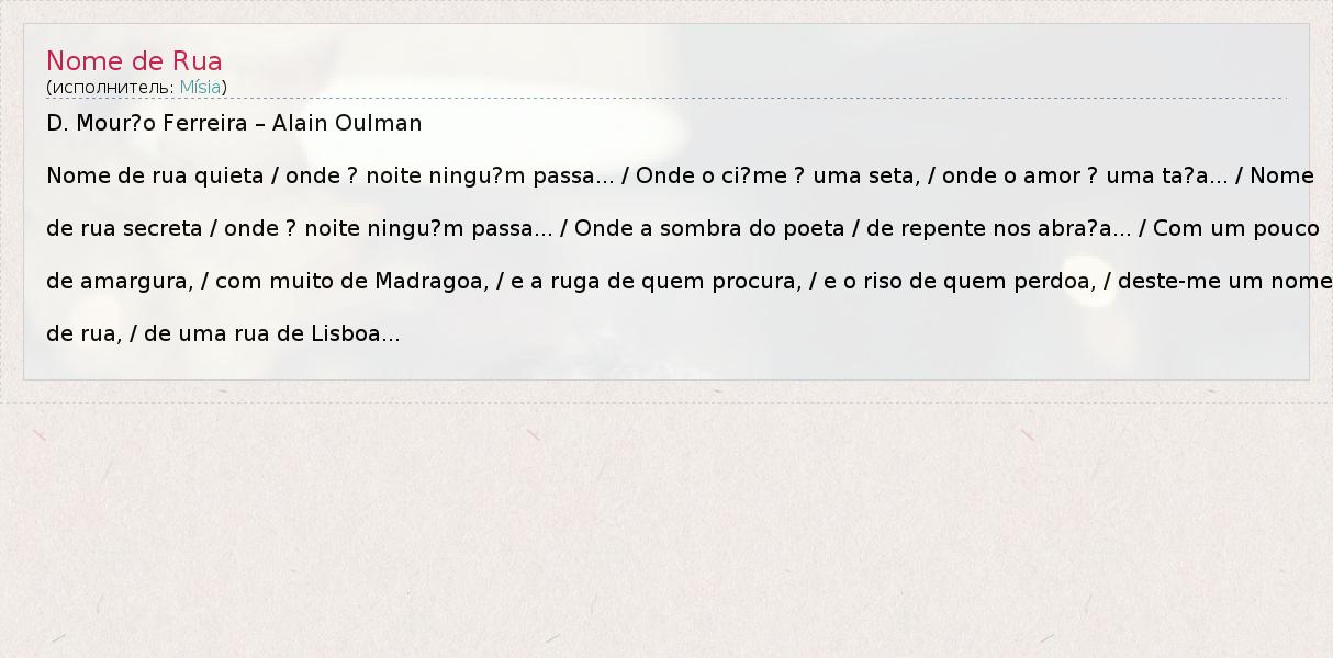 Nome de rua quieta / onde ? noite ningu?m passa... / Onde o ci?me ? uma seta, / onde o amor ? uma ta?a... / Nome