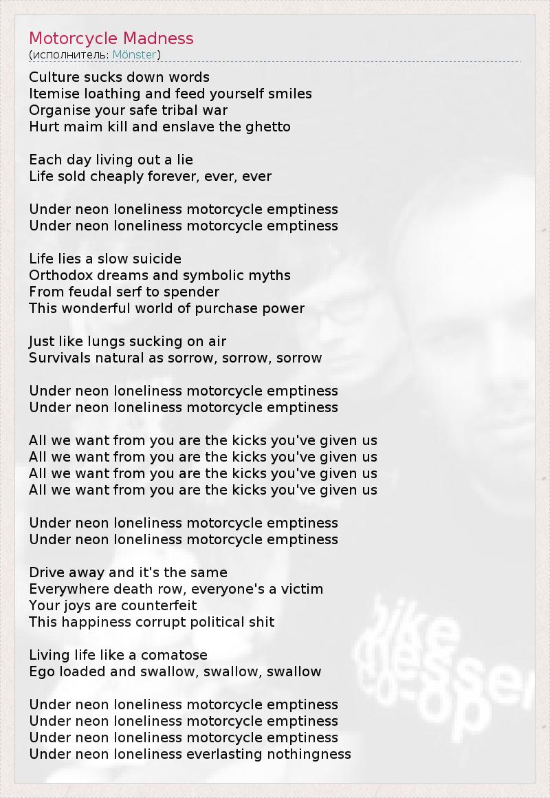 А как ты думаешь, о чем песня "Motorcycle Madness" ?