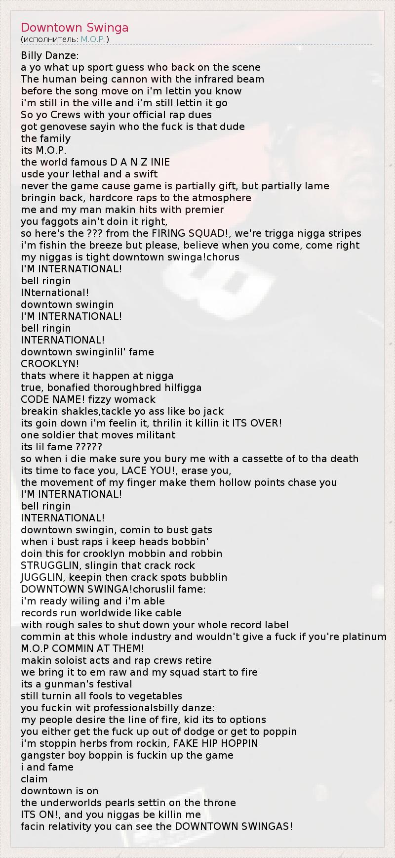 Это интересно:M.O.P. (Mash Out Posse) сформировались в 1993 году в Бруклине, Нью-Йорк, и с тех пор остаются в деле, вернув рэпу, его истинные корни: улицу.Рэпперы Lil' Fame (чей дебют попал на сборник "The Hill That's Real") и Billy Danze рифмовали вместе ещё со школы. Их дебютный сингл под названием "How About Some Hardcore?", стал саундтреком к "House Party 3", и тут же стал настоящим андеграундным хитом. После подписания контракта... продолжение