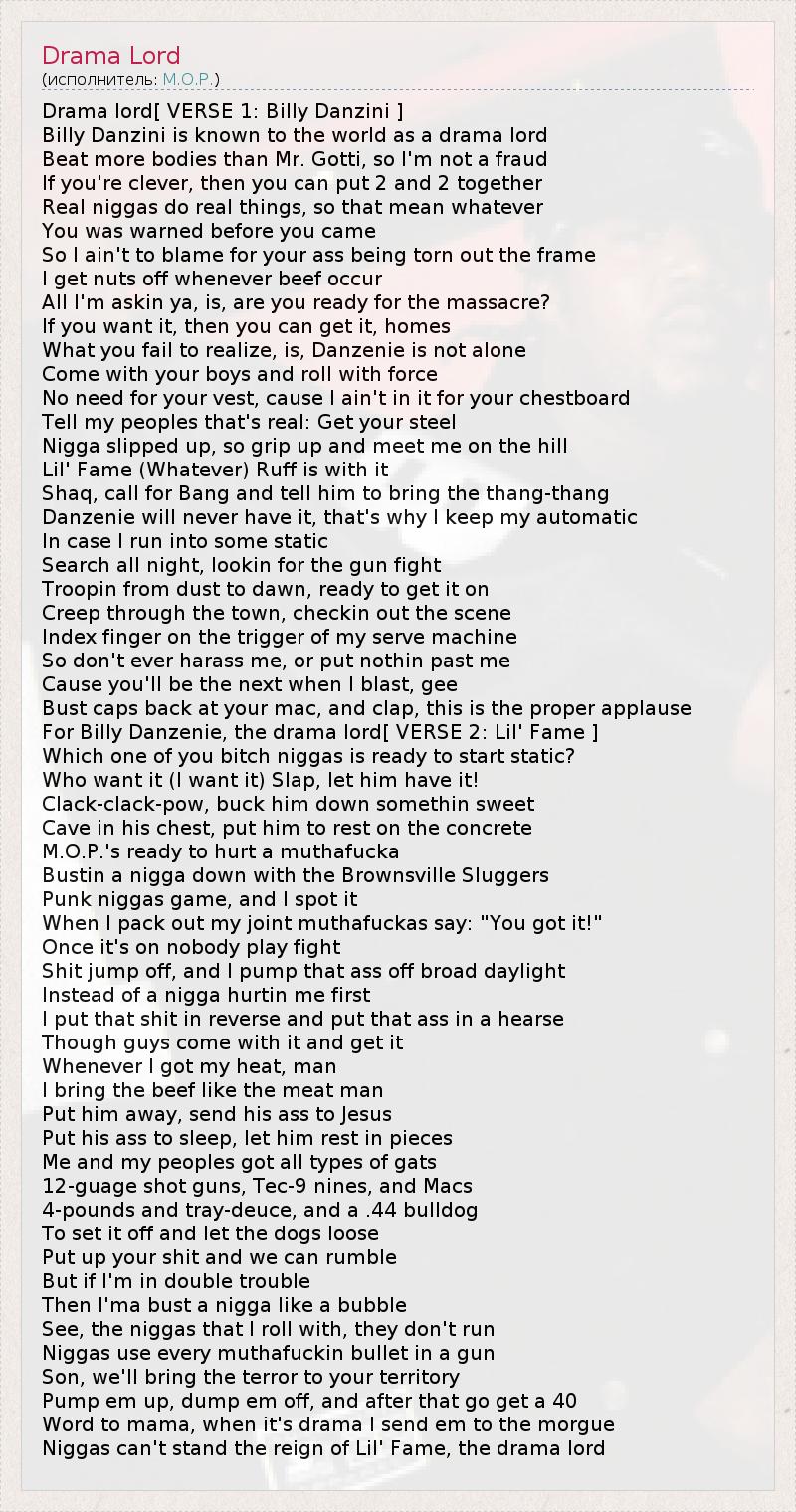 For Billy Danzenie, the drama lord[ VERSE 2: Lil' Fame ]
