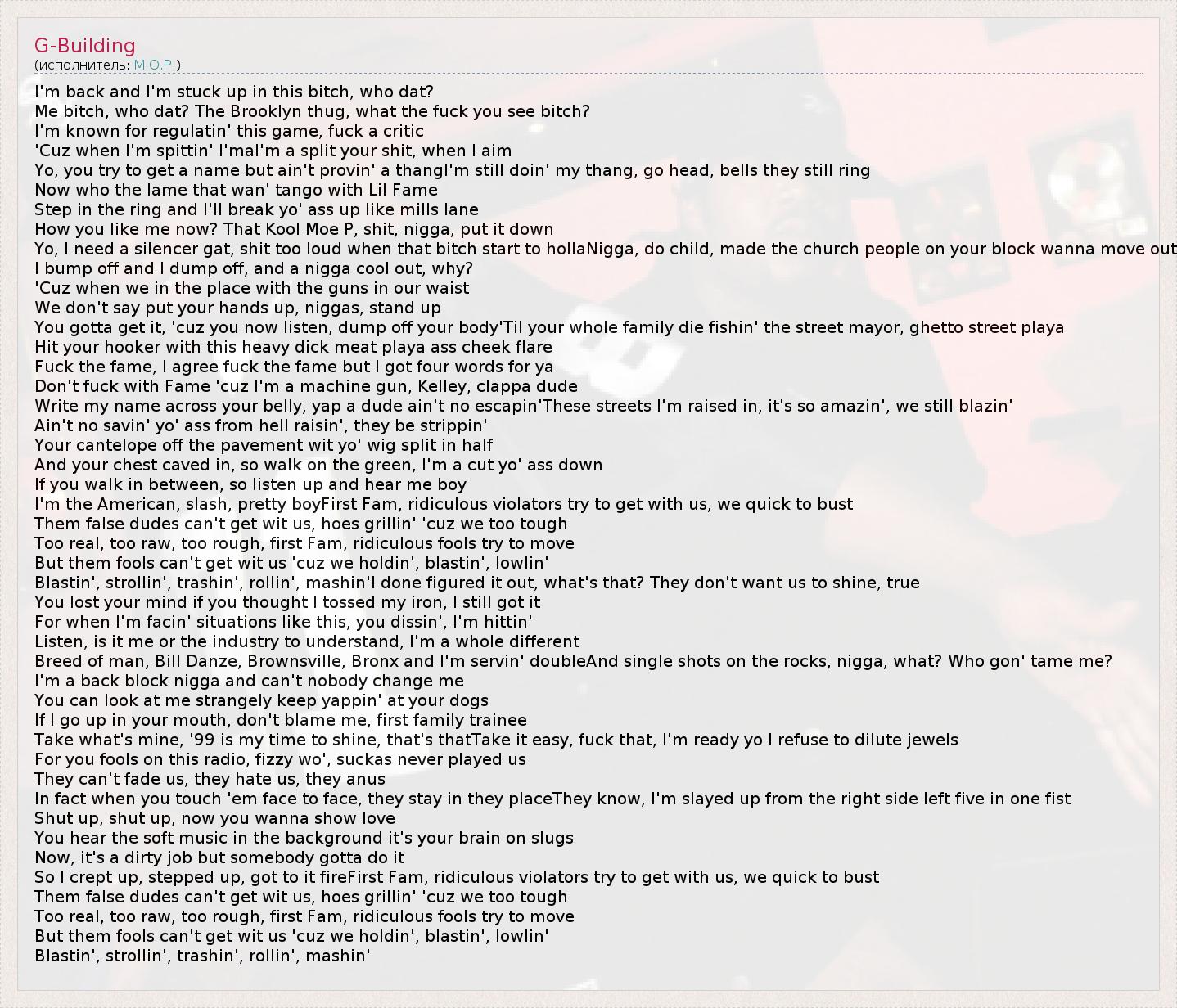 I'm back and I'm stuck up in this bitch, who dat? Me bitch, who dat? The Brooklyn thug, what the fuck you see bitch? I'm known for regulatin' this game, fuck a critic 'Cuz when I'm spittin' I'maI'm a split your shit, when I aim Yo, you try to get a name but ain't provin' a thangI'm still doin' my thang, go head, bells they still ring Now who the lame that wan' tango with Lil Fame Step in the ring and I'll break yo' ass up like mills lane How you like me now? That Kool Moe P, shit, nigga, put it down Yo, I need a silencer gat, shit too loud when that bitch start to hollaNigga, do child, made the church people on your block wanna move out I bump off and I dump off, and a nigga cool out, why? 'Cuz when we in the place with the guns in our waist We don't say put your hands up, niggas, stand up You gotta get it, 'cuz you now listen, dump off your body'Til your whole family die fishin' the street mayor, ghetto street playa Hit your hooker with this heavy dick meat playa ass cheek flare Fuck the fame, I agree fuck the fame but I got four words for ya Don't fuck with Fame 'cuz I'm a machine gun, Kelley, clappa dude Write my name across your belly, yap a dude ain't no escapin'These streets I'm raised in, it's so amazin', we still blazin' Ain't no savin' yo' ass from hell raisin', they be strippin' Your cantelope off the pavement wit yo' wig split in half And your chest caved in, so walk on the green, I'm a cut yo' ass down If you walk in between, so listen up and hear me boy I'm the American, slash, pretty boyFirst Fam, ridiculous violators try to get with us, we quick to bust Them false dudes can't get wit us, hoes grillin' 'cuz we too tough Too real, too raw, too rough, first Fam, ridiculous fools try to move But them fools can't get wit us 'cuz we holdin', blastin', lowlin' Blastin', strollin', trashin', rollin', mashin'I done figured it out, what's that? They don't want us to shine, true You lost your mind if you thought I tossed my iron, I still got it For when I'm facin' situations like this, you dissin', I'm hittin' Listen, is it me or the industry to understand, I'm a whole different Breed of man, Bill Danze, Brownsville, Bronx and I'm servin' doubleAnd single shots on the rocks, nigga, what? Who gon' tame me? I'm a back block nigga and can't nobody change me You can look at me strangely keep yappin' at your dogs If I go up in your mouth, don't blame me, first family trainee Take what's mine, '99 is my time to shine, that's thatTake it easy, fuck that, I'm ready yo I refuse to dilute jewels For you fools on this radio, fizzy wo', suckas never played us They can't fade us, they hate us, they anus In fact when you touch 'em face to face, they stay in they placeThey know, I'm slayed up from the right side left five in one fist Shut up, shut up, now you wanna show love You hear the soft music in the background it's your brain on slugs Now, it's a dirty job but somebody gotta do it So I crept up, stepped up, got to it fireFirst Fam, ridiculous violators try to get with us, we quick to bust Them false dudes can't get wit us, hoes grillin' 'cuz we too tough Too real, too raw, too rough, first Fam, ridiculous fools try to move But them fools can't get wit us 'cuz we holdin', blastin', lowlin' Blastin', strollin', trashin', rollin', mashin'