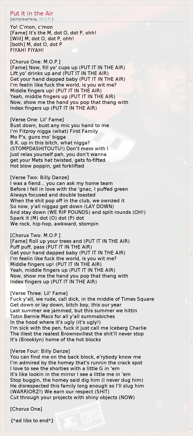 А как ты думаешь, о чем песня "Put It in the Air" ?