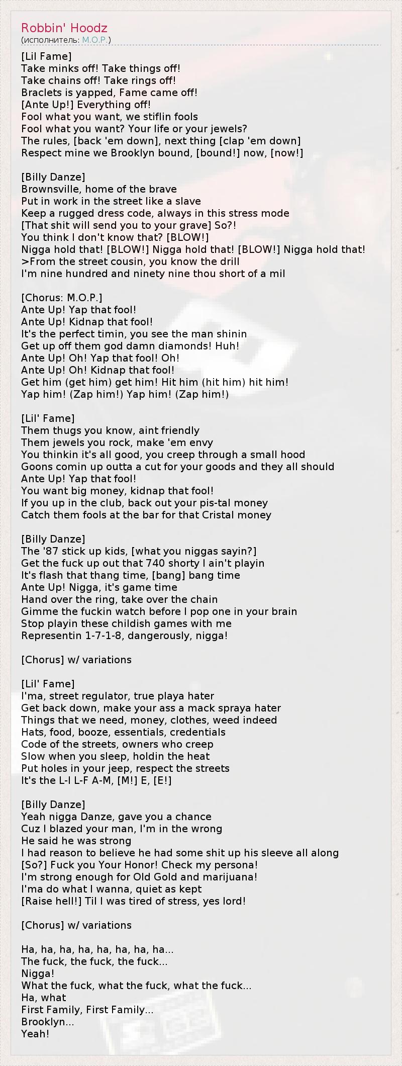 Это интересно:M.O.P. (Mash Out Posse) сформировались в 1993 году в Бруклине, Нью-Йорк, и с тех пор остаются в деле, вернув рэпу, его истинные корни: улицу.Рэпперы Lil' Fame (чей дебют попал на сборник "The Hill That's Real") и Billy Danze рифмовали вместе ещё со школы. Их дебютный сингл под названием "How About Some Hardcore?", стал саундтреком к "House Party 3", и тут же стал настоящим андеграундным хитом. После подписания контракта... продолжение