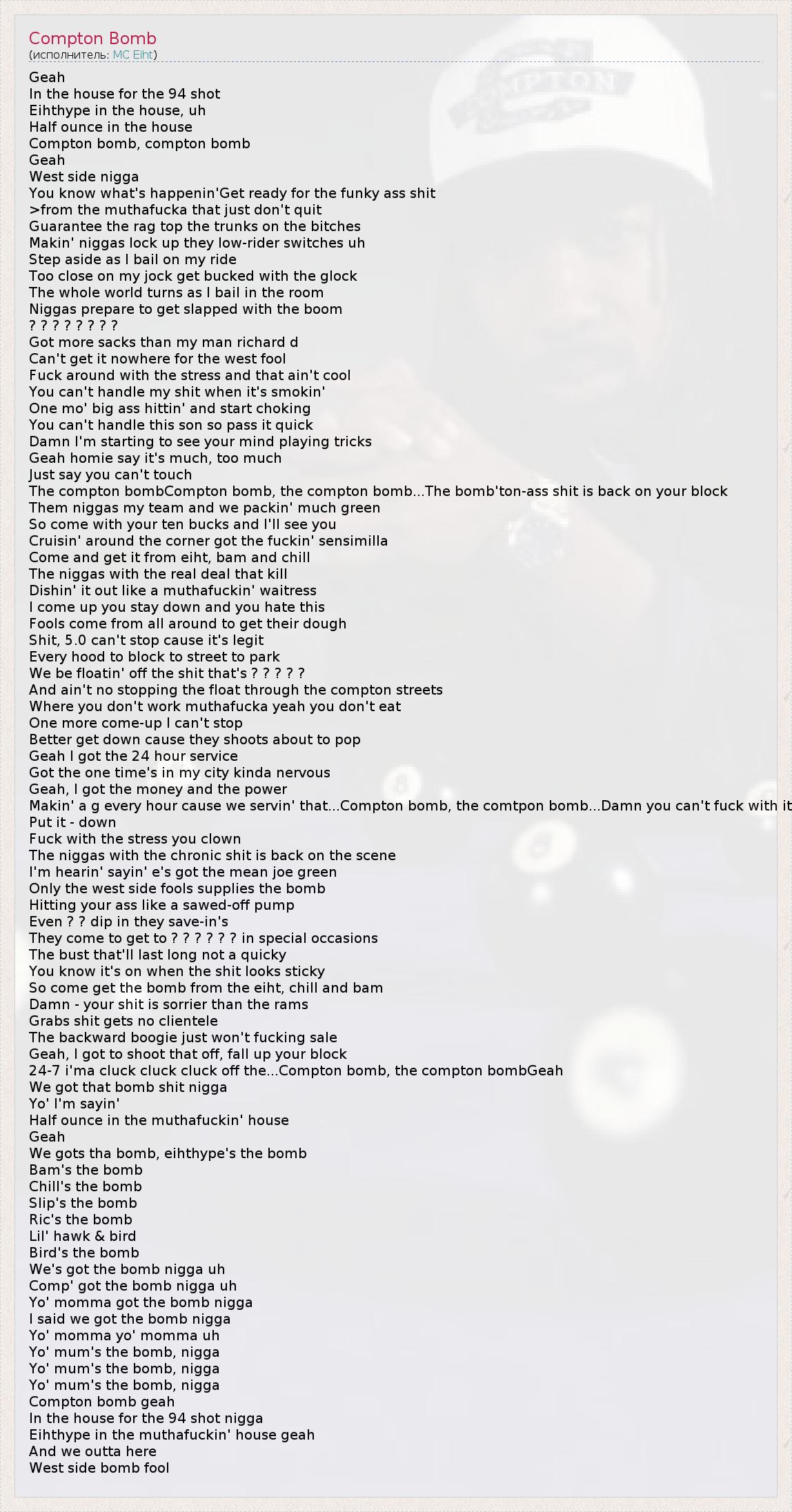 Geah In the house for the 94 shot Eihthype in the house, uh Half ounce in the house Compton bomb, compton bomb Geah West side nigga You know what's happenin'Get ready for the funky ass shit >from the muthafucka that just don't quit Guarantee the rag top the trunks on the bitches Makin' niggas lock up they low-rider switches uh Step aside as I bail on my ride Too close on my jock get bucked with the glock The whole world turns as I bail in the room Niggas prepare to get slapped with the boom ? ? ? ? ? ? ? ? Got more sacks than my man richard d Can't get it nowhere for the west fool Fuck around with the stress and that ain't cool You can't handle my shit when it's smokin' One mo' big ass hittin' and start choking You can't handle this son so pass it quick Damn I'm starting to see your mind playing tricks Geah homie say it's much, too much Just say you can't touch The compton bombCompton bomb, the compton bomb...The bomb'ton-ass shit is back on your block Them niggas my team and we packin' much green So come with your ten bucks and I'll see you Cruisin' around the corner got the fuckin' sensimilla Come and get it from eiht, bam and chill The niggas with the real deal that kill Dishin' it out like a muthafuckin' waitress I come up you stay down and you hate this Fools come from all around to get their dough Shit, 5.0 can't stop cause it's legit Every hood to block to street to park We be floatin' off the shit that's ? ? ? ? ? And ain't no stopping the float through the compton streets Where you don't work muthafucka yeah you don't eat One more come-up I can't stop Better get down cause they shoots about to pop Geah I got the 24 hour service Got the one time's in my city kinda nervous Geah, I got the money and the power Makin' a g every hour cause we servin' that...Compton bomb, the comtpon bomb...Damn you can't fuck with it Put it - down Fuck with the stress you clown The niggas with the chronic shit is back on the scene I'm hearin' sayin' e's got the mean joe green Only the west side fools supplies the bomb Hitting your ass like a sawed-off pump Even ? ? dip in they save-in's They come to get to ? ? ? ? ? ? in special occasions The bust that'll last long not a quicky You know it's on when the shit looks sticky So come get the bomb from the eiht, chill and bam Damn - your shit is sorrier than the rams Grabs shit gets no clientele The backward boogie just won't fucking sale Geah, I got to shoot that off, fall up your block 24-7 i'ma cluck cluck cluck off the...Compton bomb, the compton bombGeah We got that bomb shit nigga Yo' I'm sayin' Half ounce in the muthafuckin' house Geah We gots tha bomb, eihthype's the bomb Bam's the bomb Chill's the bomb Slip's the bomb Ric's the bomb Lil' hawk & bird Bird's the bomb We's got the bomb nigga uh Comp' got the bomb nigga uh Yo' momma got the bomb nigga I said we got the bomb nigga Yo' momma yo' momma uh Yo' mum's the bomb, nigga Yo' mum's the bomb, nigga Yo' mum's the bomb, nigga Compton bomb geah In the house for the 94 shot nigga Eihthype in the muthafuckin' house geah And we outta here West side bomb fool