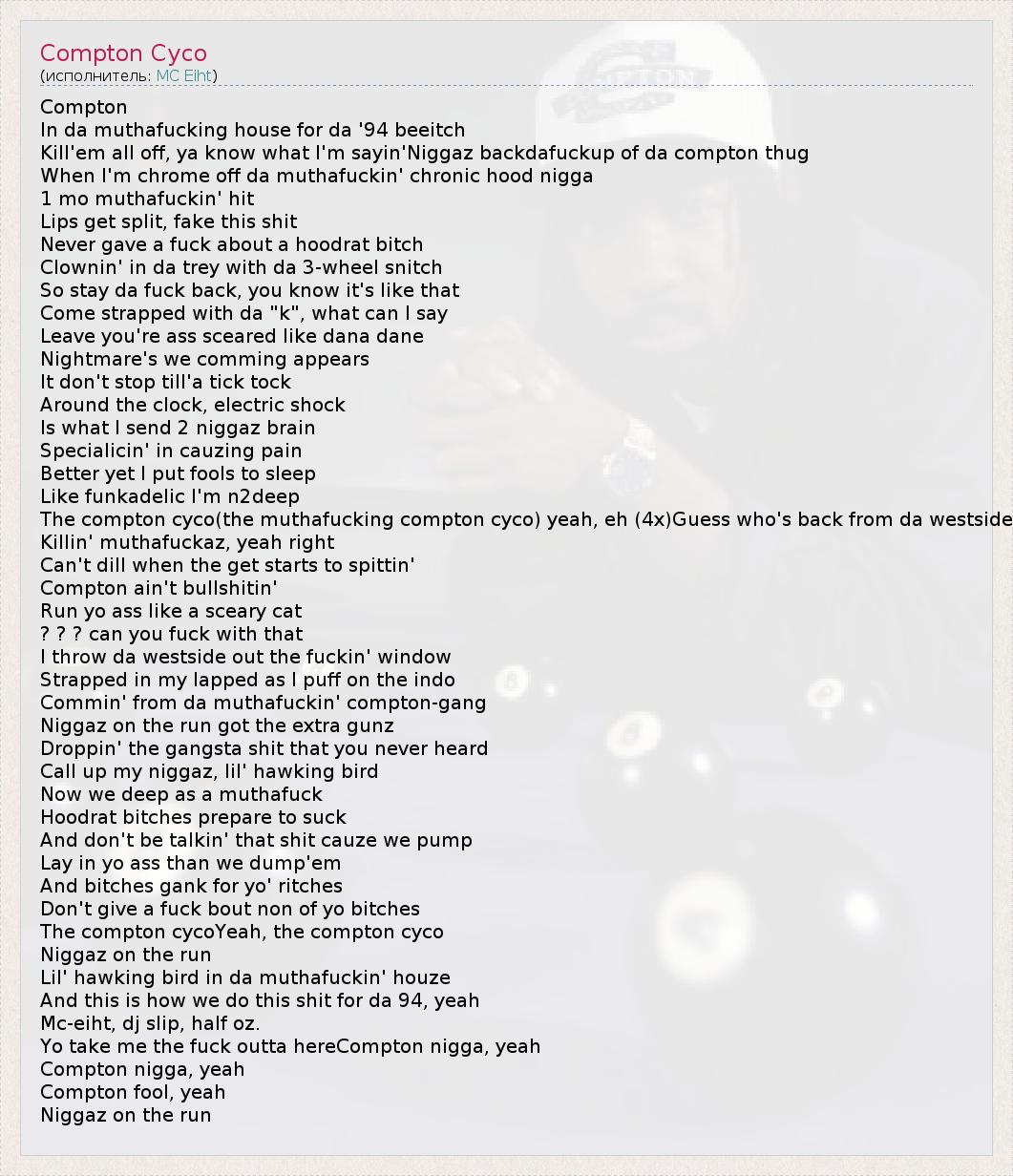 The compton cyco(the muthafucking compton cyco) yeah, eh (4x)Guess who's back from da westside