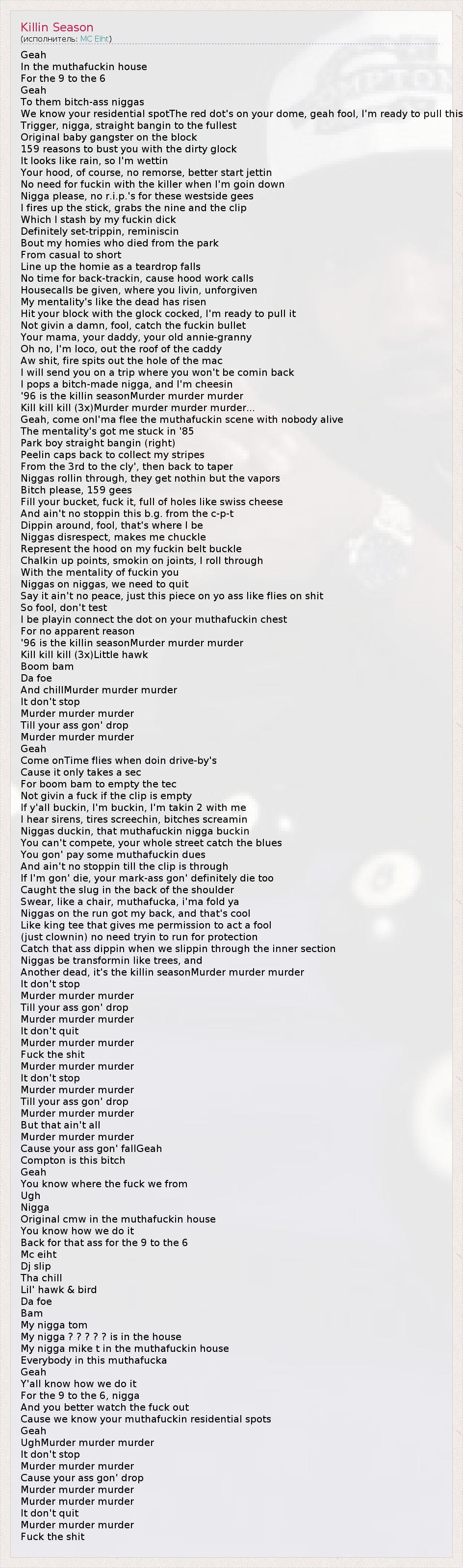 Это интересно:MC Eiht – настоящее имя Aaron Tyler, родился 22-го мая 1967-го года в Комптоне. Начал свою музыкальную карьеру в группе Compton's Most Wanted. С 1993-го года занимается сольными проектами. Известная отличительная черта: вскрик в виде "Geyyeahh".В 1994-м году вышел дебютный и самый успешный сольный альбом MC Eiht'а под названием "We Come Strapped", продюссированием которого занимался DJ Slip (продюсер Compton's Most... продолжение
