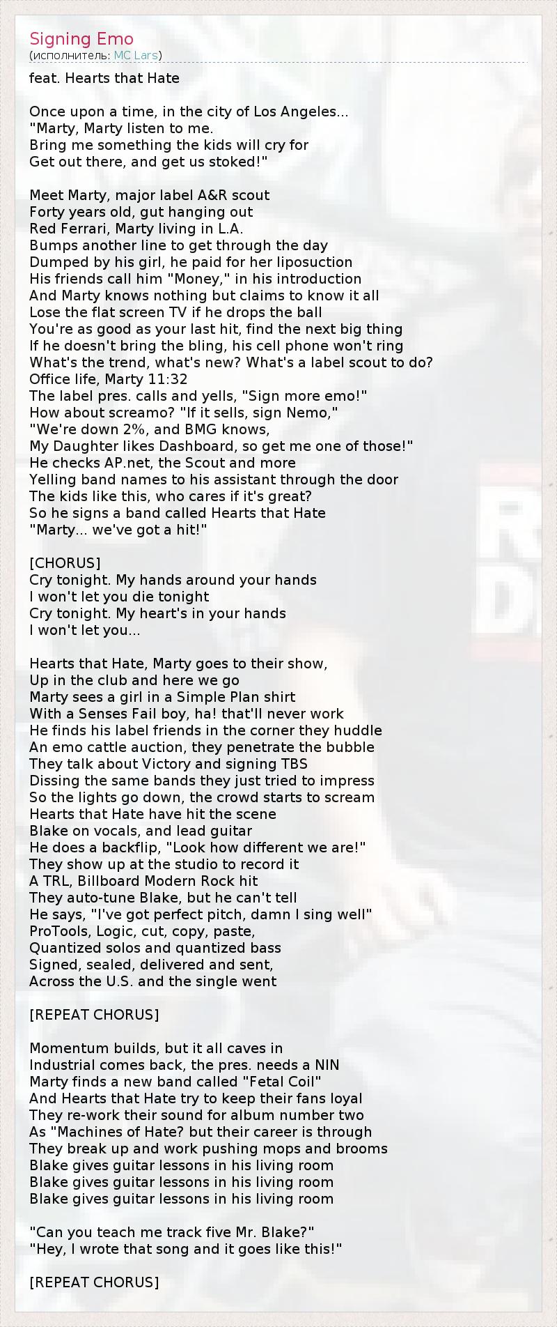 feat. Hearts that Hate Once upon a time, in the city of Los Angeles... "Marty, Marty listen to me. Bring me something the kids will cry for Get out there, and get us stoked!" Meet Marty, major label A&R scout Forty years old, gut hanging out Red Ferrari, Marty living in L.A. Bumps another line to get through the day Dumped by his girl, he paid for her liposuction His friends call him "Money," in his introduction And Marty knows nothing but claims to know it all Lose the flat screen TV if he drops the ball You're as good as your last hit, find the next big thing If he doesn't bring the bling, his cell phone won't ring What's the trend, what's new? What's a label scout to do? Office life, Marty 11:32 The label pres. calls and yells, "Sign more emo!" How about screamo? "If it sells, sign Nemo," "We're down 2%, and BMG knows, My Daughter likes Dashboard, so get me one of those!" He checks AP.net, the Scout and more Yelling band names to his assistant through the door The kids like this, who cares if it's great? So he signs a band called Hearts that Hate "Marty... we've got a hit!" [CHORUS] Cry tonight. My hands around your hands I won't let you die tonight Cry tonight. My heart's in your hands I won't let you... Hearts that Hate, Marty goes to their show, Up in the club and here we go Marty sees a girl in a Simple Plan shirt With a Senses Fail boy, ha! that'll never work He finds his label friends in the corner they huddle An emo cattle auction, they penetrate the bubble They talk about Victory and signing TBS Dissing the same bands they just tried to impress So the lights go down, the crowd starts to scream Hearts that Hate have hit the scene Blake on vocals, and lead guitar He does a backflip, "Look how different we are!" They show up at the studio to record it A TRL, Billboard Modern Rock hit They auto-tune Blake, but he can't tell He says, "I've got perfect pitch, damn I sing well" ProTools, Logic, cut, copy, paste, Quantized solos and quantized bass Signed, sealed, delivered and sent, Across the U.S. and the single went [REPEAT CHORUS] Momentum builds, but it all caves in Industrial comes back, the pres. needs a NIN Marty finds a new band called "Fetal Coil" And Hearts that Hate try to keep their fans loyal They re-work their sound for album number two As "Machines of Hate? but their career is through They break up and work pushing mops and brooms Blake gives guitar lessons in his living room Blake gives guitar lessons in his living room Blake gives guitar lessons in his living room "Can you teach me track five Mr. Blake?" "Hey, I wrote that song and it goes like this!" [REPEAT CHORUS]