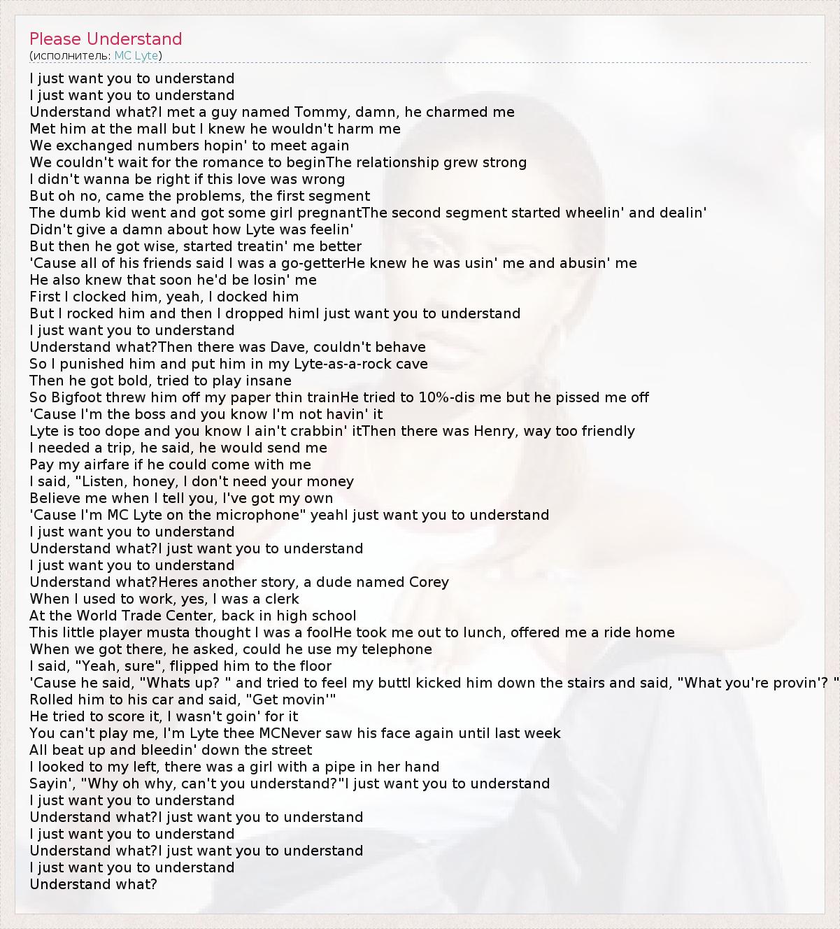 I just want you to understand I just want you to understand Understand what?I met a guy named Tommy, damn, he charmed me Met him at the mall but I knew he wouldn't harm me We exchanged numbers hopin' to meet again We couldn't wait for the romance to beginThe relationship grew strong I didn't wanna be right if this love was wrong But oh no, came the problems, the first segment The dumb kid went and got some girl pregnantThe second segment started wheelin' and dealin' Didn't give a damn about how Lyte was feelin' But then he got wise, started treatin' me better 'Cause all of his friends said I was a go-getterHe knew he was usin' me and abusin' me He also knew that soon he'd be losin' me First I clocked him, yeah, I docked him But I rocked him and then I dropped himI just want you to understand I just want you to understand Understand what?Then there was Dave, couldn't behave So I punished him and put him in my Lyte-as-a-rock cave Then he got bold, tried to play insane So Bigfoot threw him off my paper thin trainHe tried to 10%-dis me but he pissed me off 'Cause I'm the boss and you know I'm not havin' it Lyte is too dope and you know I ain't crabbin' itThen there was Henry, way too friendly I needed a trip, he said, he would send me Pay my airfare if he could come with me I said, "Listen, honey, I don't need your money Believe me when I tell you, I've got my own 'Cause I'm MC Lyte on the microphone" yeahI just want you to understand I just want you to understand Understand what?I just want you to understand I just want you to understand Understand what?Heres another story, a dude named Corey When I used to work, yes, I was a clerk At the World Trade Center, back in high school This little player musta thought I was a foolHe took me out to lunch, offered me a ride home When we got there, he asked, could he use my telephone I said, "Yeah, sure", flipped him to the floor 'Cause he said, "Whats up? " and tried to feel my buttI kicked him down the stairs and said, "What you're provin'? " Rolled him to his car and said, "Get movin'" He tried to score it, I wasn't goin' for it You can't play me, I'm Lyte thee MCNever saw his face again until last week All beat up and bleedin' down the street I looked to my left, there was a girl with a pipe in her hand Sayin', "Why oh why, can't you understand?"I just want you to understand I just want you to understand Understand what?I just want you to understand I just want you to understand Understand what?I just want you to understand I just want you to understand Understand what?