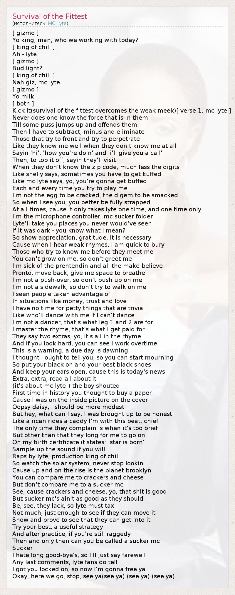 [ gizmo ] Yo king, man, who we working with today? [ king of chill ] Ah - lyte [ gizmo ] Bud light? [ king of chill ] Nah giz, mc lyte [ gizmo ] Yo milk [ both ] Kick it(survival of the fittest overcomes the weak meek)[ verse 1: mc lyte ] Never does one know the force that is in them Till some puss jumps up and offends them Then I have to subtract, minus and eliminate Those that try to front and try to perpetrate Like they know me well when they don't know me at all Sayin 'hi', 'how you're doin' and 'i'll give you a call' Then, to top it off, sayin they'll visit When they don't know the zip code, much less the digits Like shelly says, sometimes you have to get kuffed Like mc lyte says, yo, you're gonna get buffed Each and every time you try to play me I'm not the egg to be cracked, the digem to be smacked So when I see you, you better be fully strapped At all times, cause it only takes lyte one time, and one time only I'm the microphone controller, mc sucker folder Lyte'll take you places you never would've seen If it was dark - you know what I mean? So show appreciation, gratitude, it is necessary Cause when I hear weak rhymes, I am quick to bury Those who try to know me before they meet me You can't grow on me, so don't greet me I'm sick of the prentendin and all the make-believe Pronto, move back, give me space to breathe I'm not a push-over, so don't push up on me I'm not a sidewalk, so don't try to walk on me I seen people taken advantage of In situations like money, trust and love I have no time for petty things that are trivial Like who'll dance with me if I can't dance I'm not a dancer, that's what leg 1 and 2 are for I master the rhyme, that's what I get paid for They say two extras, yo, it's all in the rhyme And if you look hard, you can see I work overtime This is a warning, a due day is dawning I thought I ought to tell you, so you can start mourning So put your black on and your best black shoes And keep your ears open, cause this is today's news Extra, extra, read all about it (it's about mc lyte!) the boy shouted First time in history you thought to buy a paper Cause I was on the inside picture on the cover Oopsy daisy, I should be more modest But hey, what can I say, I was brought up to be honest Like a rican rides a caddy I'm with this beat, chief The only time they complain is when it's too brief But other than that they long for me to go on On my birth certificate it states: 'star is born' Sample up the sound if you will Raps by lyte, production king of chill So watch the solar system, never stop lookin Cause up and on the rise is the planet brooklyn You can compare me to crackers and cheese But don't compare me to a sucker mc See, cause crackers and cheese, yo, that shit is good But sucker mc's ain't as good as they should Be, see, they lack, so lyte must tax Not much, just enough to see if they can move it Show and prove to see that they can get into it Try your best, a useful strategy And after practice, if you're still raggedy Then and only then can you be called a sucker mc Sucker I hate long good-bye's, so I'll just say farewell Any last comments, lyte fans do tell I got you locked on, so now I'm gonna free ya Okay, here we go, stop, see ya(see ya) (see ya) (see ya)...