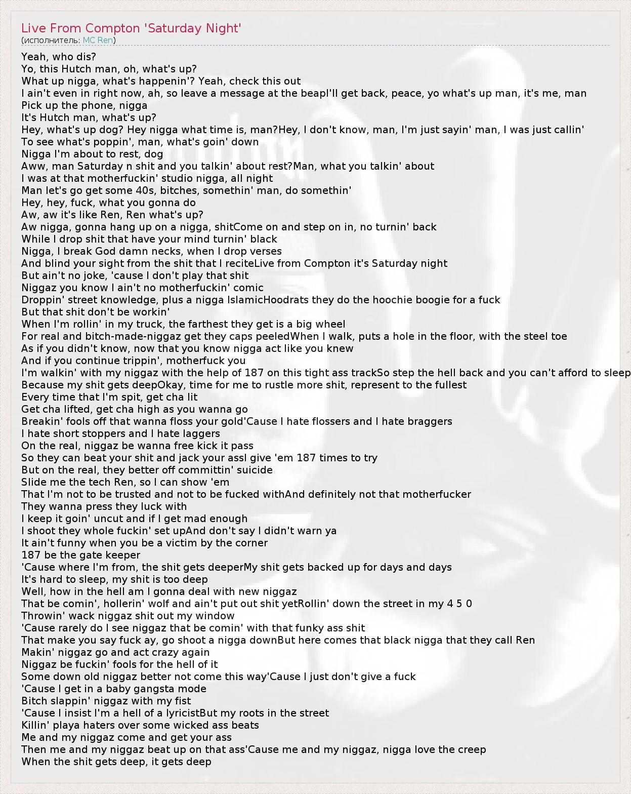 Yeah, who dis? Yo, this Hutch man, oh, what's up? What up nigga, what's happenin'? Yeah, check this out I ain't even in right now, ah, so leave a message at the beapI'll get back, peace, yo what's up man, it's me, man Pick up the phone, nigga It's Hutch man, what's up? Hey, what's up dog? Hey nigga what time is, man?Hey, I don't know, man, I'm just sayin' man, I was just callin' To see what's poppin', man, what's goin' down Nigga I'm about to rest, dog Aww, man Saturday n shit and you talkin' about rest?Man, what you talkin' about I was at that motherfuckin' studio nigga, all night Man let's go get some 40s, bitches, somethin' man, do somethin' Hey, hey, fuck, what you gonna do Aw, aw it's like Ren, Ren what's up? Aw nigga, gonna hang up on a nigga, shitCome on and step on in, no turnin' back While I drop shit that have your mind turnin' black Nigga, I break God damn necks, when I drop verses And blind your sight from the shit that I reciteLive from Compton it's Saturday night But ain't no joke, 'cause I don't play that shit Niggaz you know I ain't no motherfuckin' comic Droppin' street knowledge, plus a nigga IslamicHoodrats they do the hoochie boogie for a fuck But that shit don't be workin' When I'm rollin' in my truck, the farthest they get is a big wheel For real and bitch-made-niggaz get they caps peeledWhen I walk, puts a hole in the floor, with the steel toe As if you didn't know, now that you know nigga act like you knew And if you continue trippin', motherfuck you I'm walkin' with my niggaz with the help of 187 on this tight ass trackSo step the hell back and you can't afford to sleep Because my shit gets deepOkay, time for me to rustle more shit, represent to the fullest Every time that I'm spit, get cha lit Get cha lifted, get cha high as you wanna go Breakin' fools off that wanna floss your gold'Cause I hate flossers and I hate braggers I hate short stoppers and I hate laggers On the real, niggaz be wanna free kick it pass So they can beat your shit and jack your assI give 'em 187 times to try But on the real, they better off committin' suicide Slide me the tech Ren, so I can show 'em That I'm not to be trusted and not to be fucked withAnd definitely not that motherfucker They wanna press they luck with I keep it goin' uncut and if I get mad enough I shoot they whole fuckin' set upAnd don't say I didn't warn ya It ain't funny when you be a victim by the corner 187 be the gate keeper 'Cause where I'm from, the shit gets deeperMy shit gets backed up for days and days It's hard to sleep, my shit is too deep Well, how in the hell am I gonna deal with new niggaz That be comin', hollerin' wolf and ain't put out shit yetRollin' down the street in my 4 5 0 Throwin' wack niggaz shit out my window 'Cause rarely do I see niggaz that be comin' with that funky ass shit That make you say fuck ay, go shoot a nigga downBut here comes that black nigga that they call Ren Makin' niggaz go and act crazy again Niggaz be fuckin' fools for the hell of it Some down old niggaz better not come this way'Cause I just don't give a fuck 'Cause I get in a baby gangsta mode Bitch slappin' niggaz with my fist 'Cause I insist I'm a hell of a lyricistBut my roots in the street Killin' playa haters over some wicked ass beats Me and my niggaz come and get your ass Then me and my niggaz beat up on that ass'Cause me and my niggaz, nigga love the creep When the shit gets deep, it gets deep