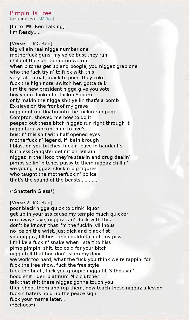 Это интересно:Уроженец Комптона Лоренцо Паттерсон (Lorenzo Patterson), он же MC Ren, он же Villain In Black, он же Bitch Made Nigga Killa, он же Shock Of The Hour и Mad Scientist, хорошо помнит, как 17–летним подростком прямо из школы его взяли, как потом оказалось, в одну из самых революционных рэп–групп всех времен и народов. А стоял за всем этим делом, как вы, наверное, догадываетесь, Eazy–E. Позже во вкладыше альбома "Eternal E" Рен напишет следующие... продолжение