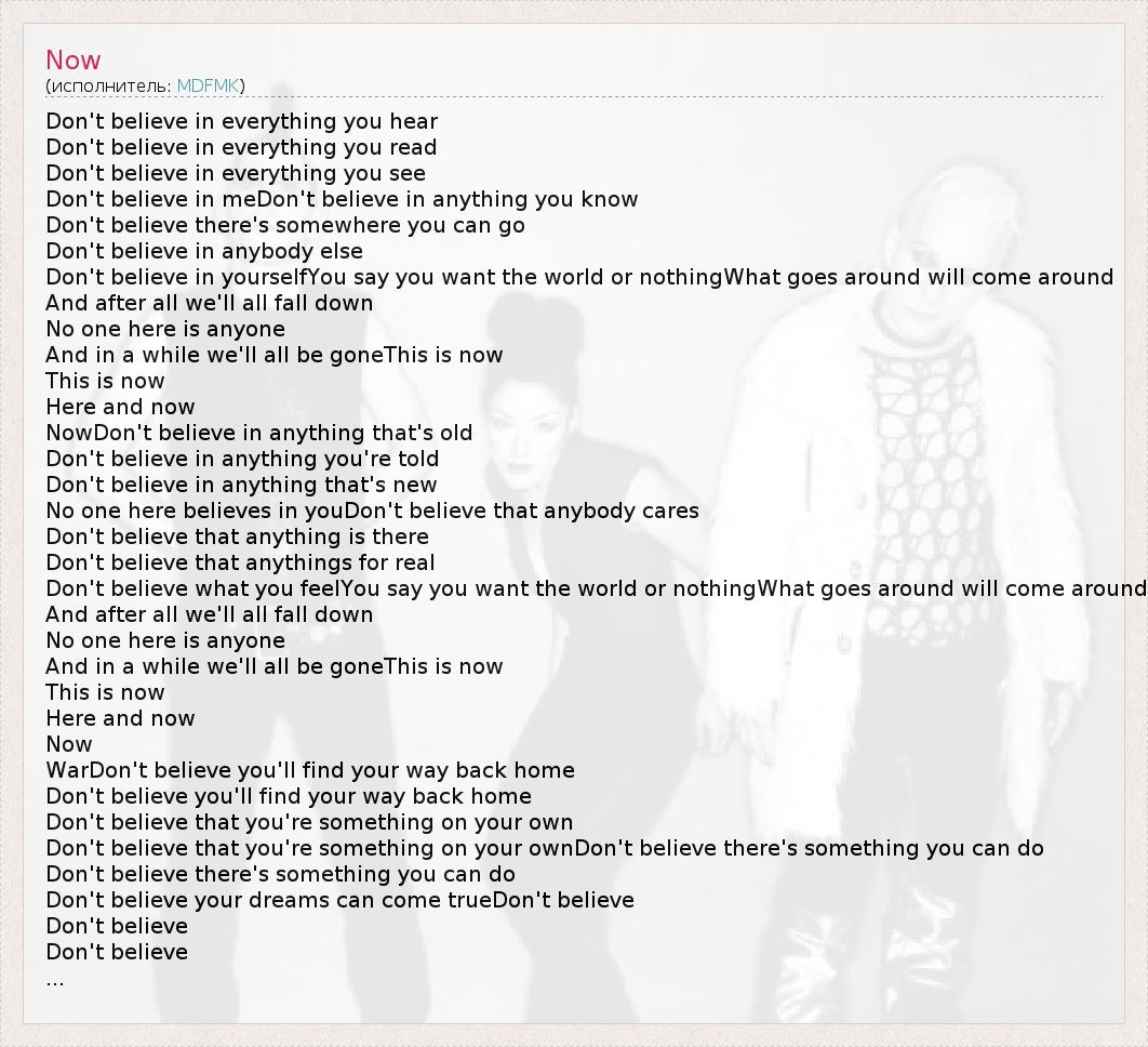 Don't believe what you feelYou say you want the world or nothingWhat goes around will come around