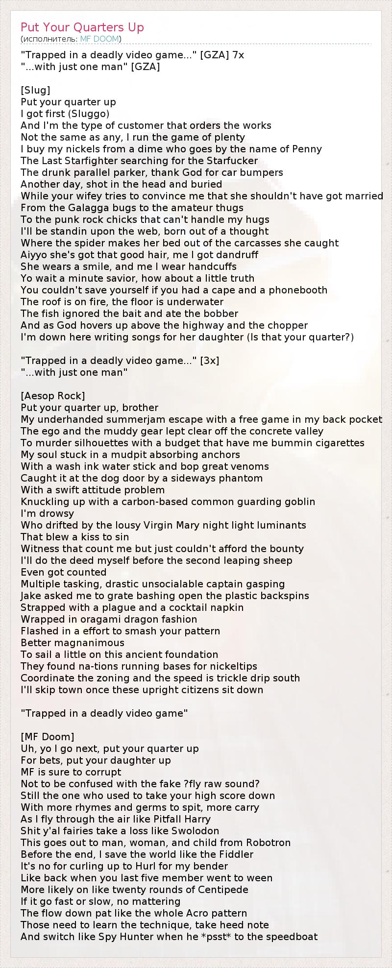 "Trapped in a deadly video game..." [GZA] 7x "...with just one man" [GZA] [Slug] Put your quarter up I got first (Sluggo) And I'm the type of customer that orders the works Not the same as any, I run the game of plenty I buy my nickels from a dime who goes by the name of Penny The Last Starfighter searching for the Starfucker The drunk parallel parker, thank God for car bumpers Another day, shot in the head and buried While your wifey tries to convince me that she shouldn't have got married From the Galagga bugs to the amateur thugs To the punk rock chicks that can't handle my hugs I'll be standin upon the web, born out of a thought Where the spider makes her bed out of the carcasses she caught Aiyyo she's got that good hair, me I got dandruff She wears a smile, and me I wear handcuffs Yo wait a minute savior, how about a little truth You couldn't save yourself if you had a cape and a phonebooth The roof is on fire, the floor is underwater The fish ignored the bait and ate the bobber And as God hovers up above the highway and the chopper I'm down here writing songs for her daughter (Is that your quarter?) "Trapped in a deadly video game..." [3x] "...with just one man" [Aesop Rock] Put your quarter up, brother My underhanded summerjam escape with a free game in my back pocket The ego and the muddy gear lept clear off the concrete valley To murder silhouettes with a budget that have me bummin cigarettes My soul stuck in a mudpit absorbing anchors With a wash ink water stick and bop great venoms Caught it at the dog door by a sideways phantom With a swift attitude problem Knuckling up with a carbon-based common guarding goblin I'm drowsy Who drifted by the lousy Virgin Mary night light luminants That blew a kiss to sin Witness that count me but just couldn't afford the bounty I'll do the deed myself before the second leaping sheep Even got counted Multiple tasking, drastic unsocialable captain gasping Jake asked me to grate bashing open the plastic backspins Strapped with a plague and a cocktail napkin Wrapped in oragami dragon fashion Flashed in a effort to smash your pattern Better magnanimous To sail a little on this ancient foundation They found na-tions running bases for nickeltips Coordinate the zoning and the speed is trickle drip south I'll skip town once these upright citizens sit down "Trapped in a deadly video game" [MF Doom] Uh, yo I go next, put your quarter up For bets, put your daughter up MF is sure to corrupt Not to be confused with the fake ?fly raw sound? Still the one who used to take your high score down With more rhymes and germs to spit, more carry As I fly through the air like Pitfall Harry Shit y'al fairies take a loss like Swolodon This goes out to man, woman, and child from Robotron Before the end, I save the world like the Fiddler It's no for curling up to Hurl for my bender Like back when you last five member went to ween More likely on like twenty rounds of Centipede If it go fast or slow, no mattering The flow down pat like the whole Acro pattern Those need to learn the technique, take heed note And switch like Spy Hunter when he *psst* to the speedboat