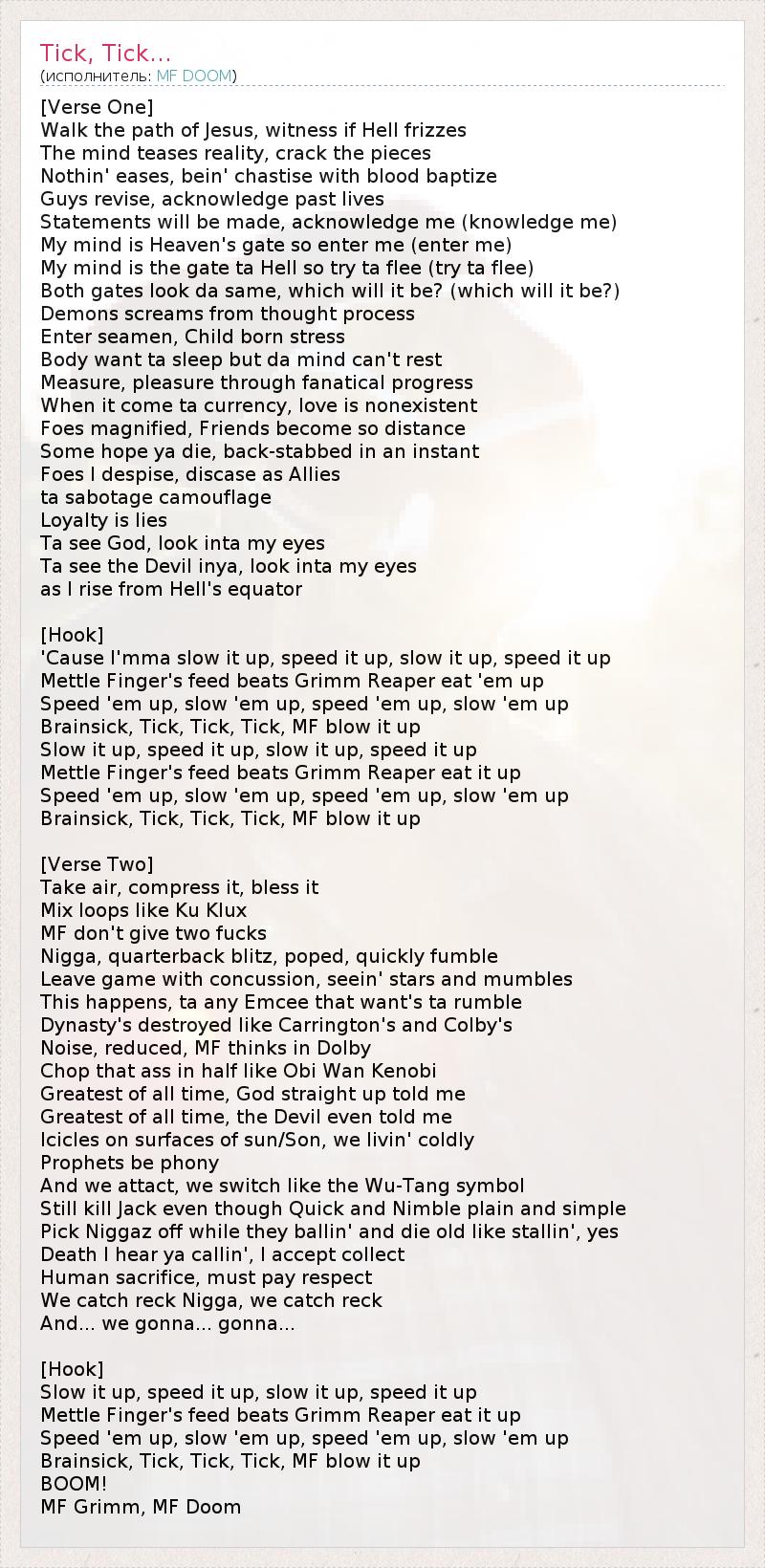 [Verse One] Walk the path of Jesus, witness if Hell frizzes The mind teases reality, crack the pieces Nothin' eases, bein' chastise with blood baptize Guys revise, acknowledge past lives Statements will be made, acknowledge me (knowledge me) My mind is Heaven's gate so enter me (enter me) My mind is the gate ta Hell so try ta flee (try ta flee) Both gates look da same, which will it be? (which will it be?) Demons screams from thought process Enter seamen, Child born stress Body want ta sleep but da mind can't rest Measure, pleasure through fanatical progress When it come ta currency, love is nonexistent Foes magnified, Friends become so distance Some hope ya die, back-stabbed in an instant Foes I despise, discase as Allies ta sabotage camouflage Loyalty is lies Ta see God, look inta my eyes Ta see the Devil inya, look inta my eyes as I rise from Hell's equator [Hook] 'Cause I'mma slow it up, speed it up, slow it up, speed it up Mettle Finger's feed beats Grimm Reaper eat 'em up Speed 'em up, slow 'em up, speed 'em up, slow 'em up Brainsick, Tick, Tick, Tick, MF blow it up Slow it up, speed it up, slow it up, speed it up Mettle Finger's feed beats Grimm Reaper eat it up Speed 'em up, slow 'em up, speed 'em up, slow 'em up Brainsick, Tick, Tick, Tick, MF blow it up [Verse Two] Take air, compress it, bless it Mix loops like Ku Klux MF don't give two fucks Nigga, quarterback blitz, poped, quickly fumble Leave game with concussion, seein' stars and mumbles This happens, ta any Emcee that want's ta rumble Dynasty's destroyed like Carrington's and Colby's Noise, reduced, MF thinks in Dolby Chop that ass in half like Obi Wan Kenobi Greatest of all time, God straight up told me Greatest of all time, the Devil even told me Icicles on surfaces of sun/Son, we livin' coldly Prophets be phony And we attact, we switch like the Wu-Tang symbol Still kill Jack even though Quick and Nimble plain and simple Pick Niggaz off while they ballin' and die old like stallin', yes Death I hear ya callin', I accept collect Human sacrifice, must pay respect We catch reck Nigga, we catch reck And... we gonna... gonna... [Hook] Slow it up, speed it up, slow it up, speed it up Mettle Finger's feed beats Grimm Reaper eat it up Speed 'em up, slow 'em up, speed 'em up, slow 'em up Brainsick, Tick, Tick, Tick, MF blow it up BOOM! MF Grimm, MF Doom