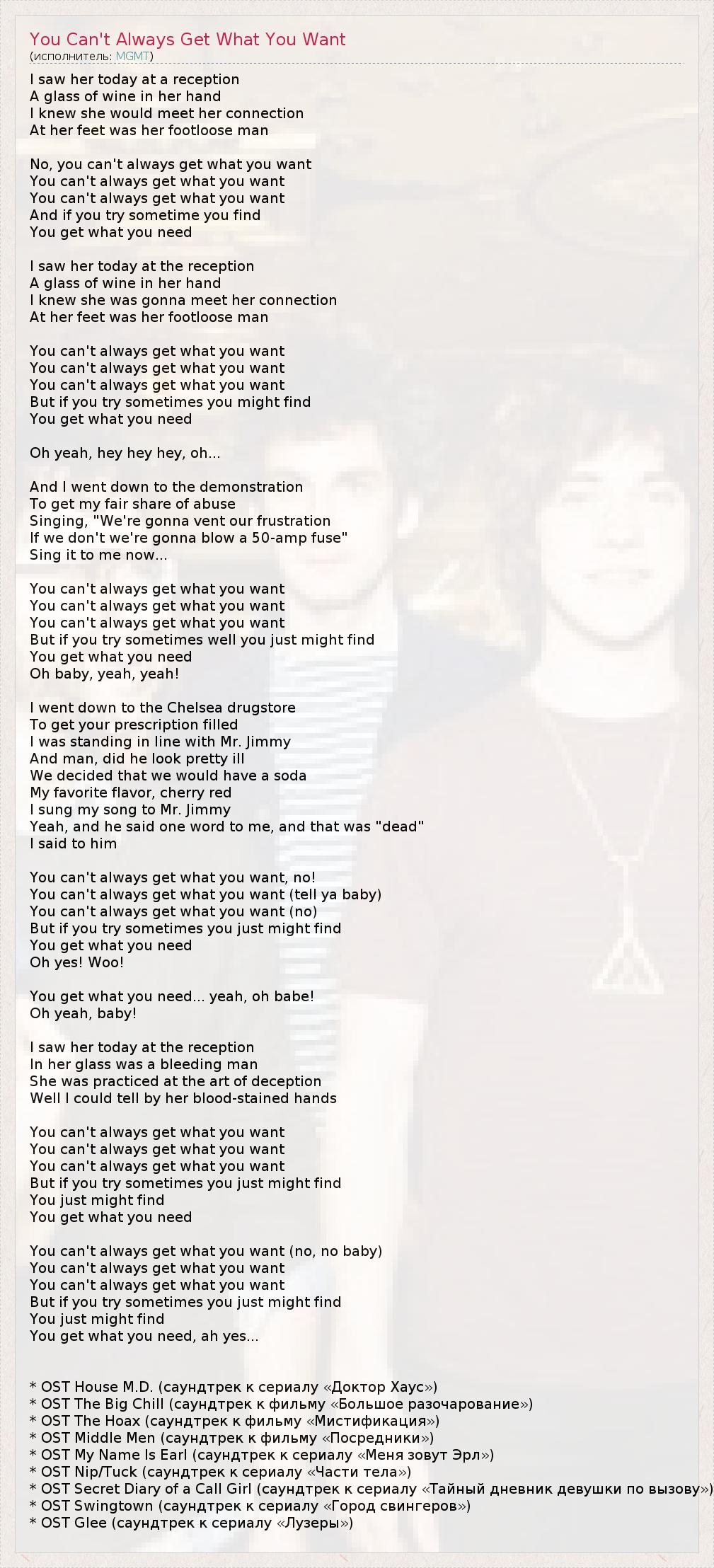 ГлавнаяИсполнителиMGMTYou Can't Always Get What You Want
