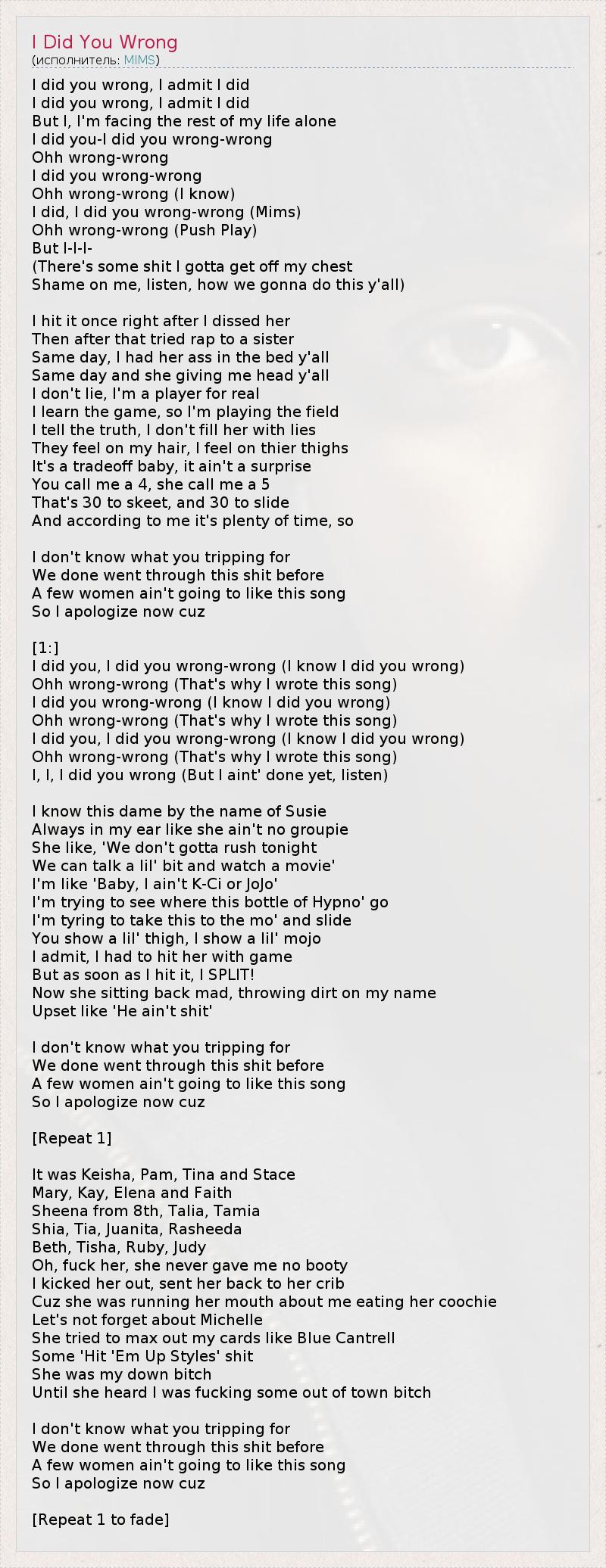 I did you wrong, I admit I did I did you wrong, I admit I did But I, I'm facing the rest of my life alone I did you-I did you wrong-wrong Ohh wrong-wrong I did you wrong-wrong Ohh wrong-wrong (I know) I did, I did you wrong-wrong (Mims) Ohh wrong-wrong (Push Play) But I-I-I- (There's some shit I gotta get off my chest Shame on me, listen, how we gonna do this y'all) I hit it once right after I dissed her Then after that tried rap to a sister Same day, I had her ass in the bed y'all Same day and she giving me head y'all I don't lie, I'm a player for real I learn the game, so I'm playing the field I tell the truth, I don't fill her with lies They feel on my hair, I feel on thier thighs It's a tradeoff baby, it ain't a surprise You call me a 4, she call me a 5 That's 30 to skeet, and 30 to slide And according to me it's plenty of time, so I don't know what you tripping for We done went through this shit before A few women ain't going to like this song So I apologize now cuz [1:] I did you, I did you wrong-wrong (I know I did you wrong) Ohh wrong-wrong (That's why I wrote this song) I did you wrong-wrong (I know I did you wrong) Ohh wrong-wrong (That's why I wrote this song) I did you, I did you wrong-wrong (I know I did you wrong) Ohh wrong-wrong (That's why I wrote this song) I, I, I did you wrong (But I aint' done yet, listen) I know this dame by the name of Susie Always in my ear like she ain't no groupie She like, 'We don't gotta rush tonight We can talk a lil' bit and watch a movie' I'm like 'Baby, I ain't K-Ci or JoJo' I'm trying to see where this bottle of Hypno' go I'm tyring to take this to the mo' and slide You show a lil' thigh, I show a lil' mojo I admit, I had to hit her with game But as soon as I hit it, I SPLIT! Now she sitting back mad, throwing dirt on my name Upset like 'He ain't shit' I don't know what you tripping for We done went through this shit before A few women ain't going to like this song So I apologize now cuz [Repeat 1] It was Keisha, Pam, Tina and Stace Mary, Kay, Elena and Faith Sheena from 8th, Talia, Tamia Shia, Tia, Juanita, Rasheeda Beth, Tisha, Ruby, Judy Oh, fuck her, she never gave me no booty I kicked her out, sent her back to her crib Cuz she was running her mouth about me eating her coochie Let's not forget about Michelle She tried to max out my cards like Blue Cantrell Some 'Hit 'Em Up Styles' shit She was my down bitch Until she heard I was fucking some out of town bitch I don't know what you tripping for We done went through this shit before A few women ain't going to like this song So I apologize now cuz [Repeat 1 to fade]