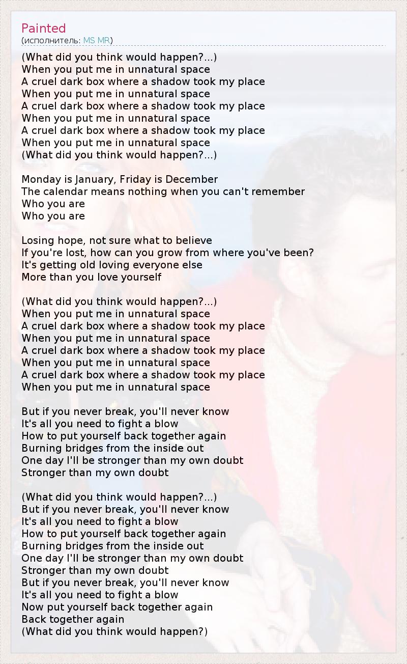 (What did you think would happen?...) When you put me in unnatural space A cruel dark box where a shadow took my place When you put me in unnatural space A cruel dark box where a shadow took my place When you put me in unnatural space A cruel dark box where a shadow took my place When you put me in unnatural space (What did you think would happen?...) Monday is January, Friday is December The calendar means nothing when you can't remember Who you are Who you are Losing hope, not sure what to believe If you're lost, how can you grow from where you've been? It's getting old loving everyone else More than you love yourself (What did you think would happen?...) When you put me in unnatural space A cruel dark box where a shadow took my place When you put me in unnatural space A cruel dark box where a shadow took my place When you put me in unnatural space A cruel dark box where a shadow took my place When you put me in unnatural space But if you never break, you'll never know It's all you need to fight a blow How to put yourself back together again Burning bridges from the inside out One day I'll be stronger than my own doubt Stronger than my own doubt (What did you think would happen?...) But if you never break, you'll never know It's all you need to fight a blow How to put yourself back together again Burning bridges from the inside out One day I'll be stronger than my own doubt Stronger than my own doubt But if you never break, you'll never know It's all you need to fight a blow Now put yourself back together again Back together again (What did you think would happen?)