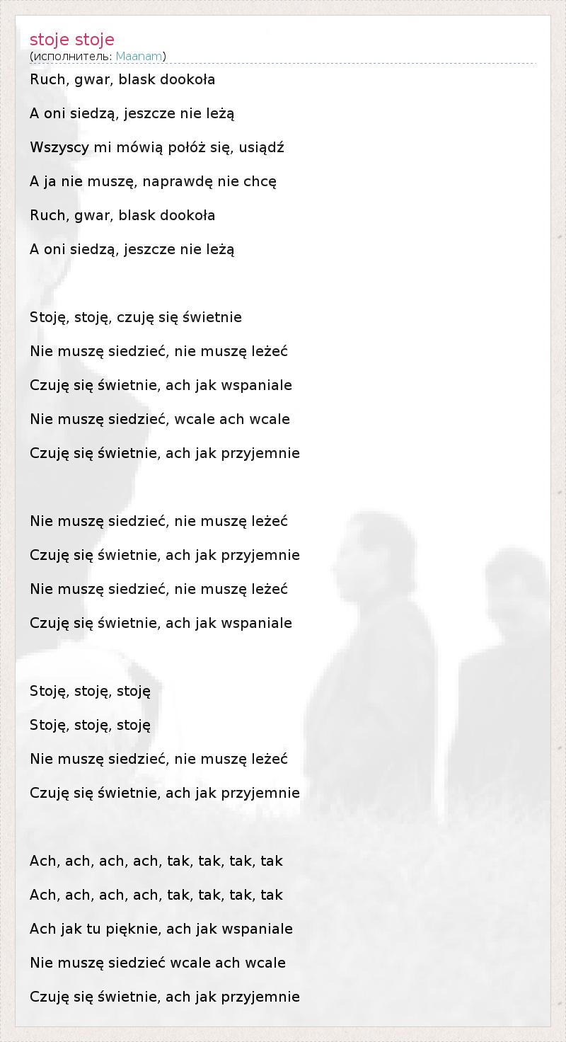 Ruch, gwar, blask dookoła A oni siedzą, jeszcze nie leżą Wszyscy mi mówią połóż się, usiądź A ja nie muszę, naprawdę nie chcę Ruch, gwar, blask dookoła A oni siedzą, jeszcze nie leżą Stoję, stoję, czuję się świetnie Nie muszę siedzieć, nie muszę leżeć Czuję się świetnie, ach jak wspaniale Nie muszę siedzieć, wcale ach wcale Czuję się świetnie, ach jak przyjemnie Nie muszę siedzieć, nie muszę leżeć Czuję się świetnie, ach jak przyjemnie Nie muszę siedzieć, nie muszę leżeć Czuję się świetnie, ach jak wspaniale Stoję, stoję, stoję Stoję, stoję, stoję Nie muszę siedzieć, nie muszę leżeć Czuję się świetnie, ach jak przyjemnie Ach, ach, ach, ach, tak, tak, tak, tak Ach, ach, ach, ach, tak, tak, tak, tak Ach jak tu pięknie, ach jak wspaniale Nie muszę siedzieć wcale ach wcale Czuję się świetnie, ach jak przyjemnie