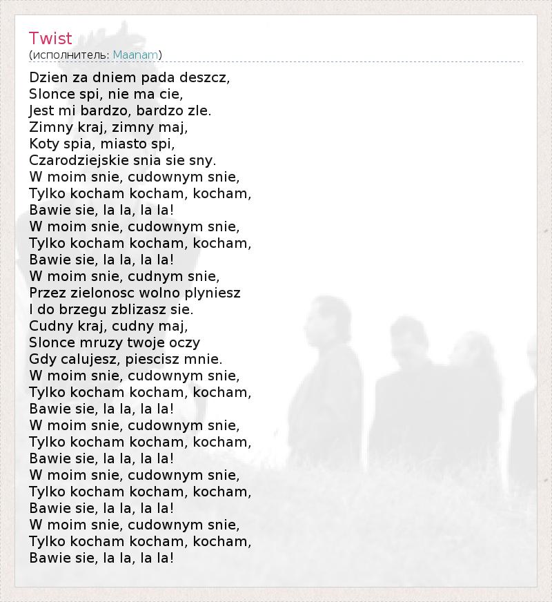 Это интересно:В декабре 1975 года Марек Яцковский и Мило Кертис дали свой первый совместный концерт в Варшаве. Сперва они называли себя «Марек и Мило», а затем из инициалов их имен получилось протяжное «Маанам». Годя спустя к ним присоединилась Кора (Ольга Яцковская), и именно на ее стихи была впоследствии написана большая часть композиций группы. Ошеломлющей популярность группы добилась в 1980 году после... продолжение