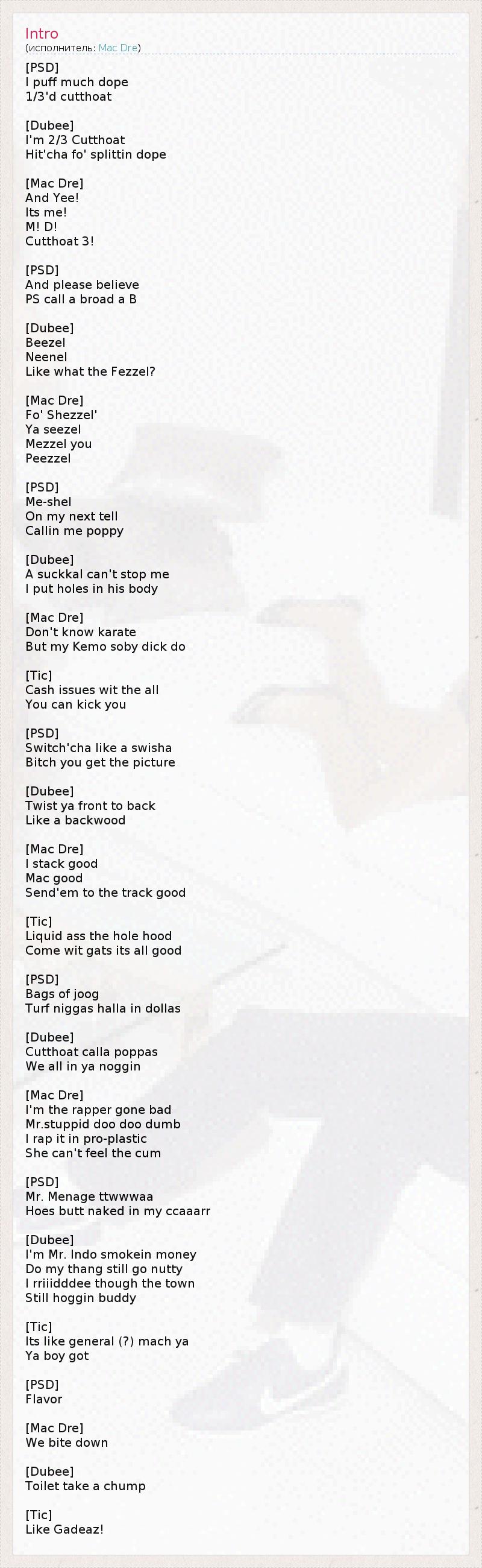 Это интересно:Андре Хикс (5 июля 1970 - 1 ноября 2004 года), более известный под своим сценическим псевдонимом, Mac Dre, был Сан-Франциско основе гангста-рэппер из Вальехо, Калифорния. Он считается одним из новаторов Hyphy движение музыки. За свою карьеру в рэп-мире, он работал с такими артистами как Snoop Dogg, Доктор Дре сводный брат Warren G, Kokane, Da'unda'dogg, Mistah FAB, MC Hammer, Mac Mall, Сан-Куинн, E-40, Too $ Хорт, Yukmouth, Андре Nickatina, Ray... продолжение
