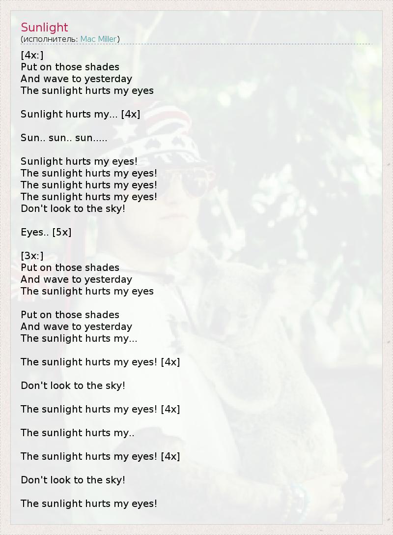 [4x:] Окунись в этот полумрак И уплывай во вчерашний день. Солнечный свет причиняет боль моим глазам! Солнечный свет причиняет боль моим... [4x] Солнце... солнце... солнце... Солнечный свет причиняет боль моим глазам! Солнечный свет причиняет боль моим глазам! Солнечный свет причиняет боль моим глазам! Солнечный свет причиняет боль моим глазам! Не смотри на небо! Глазам... [5x] [3x:] Окунись в этот полумрак И уплывай во вчерашний день. Солнечный свет причиняет боль моим глазам. Окунись в этот полумрак И уплывай во вчерашний день. Солнечный свет причиняет боль моим... Солнечный свет причиняет боль моим глазам! [4x] Не смотри на небо! Солнечный свет причиняет боль моим глазам! [4x] Солнечный свет причиняет боль моим... Солнечный свет причиняет боль моим глазам! [4x] Не смотри на небо! Солнечный свет причиняет боль моим глазам!