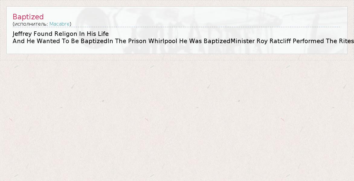 Это интересно:Есть несколько групп с таким названием:1. Эта дез-металлическая группа (из г. Чикаго, США) была основана в далеком 1985 году. На протяжении уже несколько десятилетий, эти "сорви-головы" продолжают оставаться в строю. Их зубодробительная лирика повествует о серийных убийцах и их жертвах. В группу входят три участника коллектива: Нефариус (бас/вокал), Корпорация Смерти... продолжение