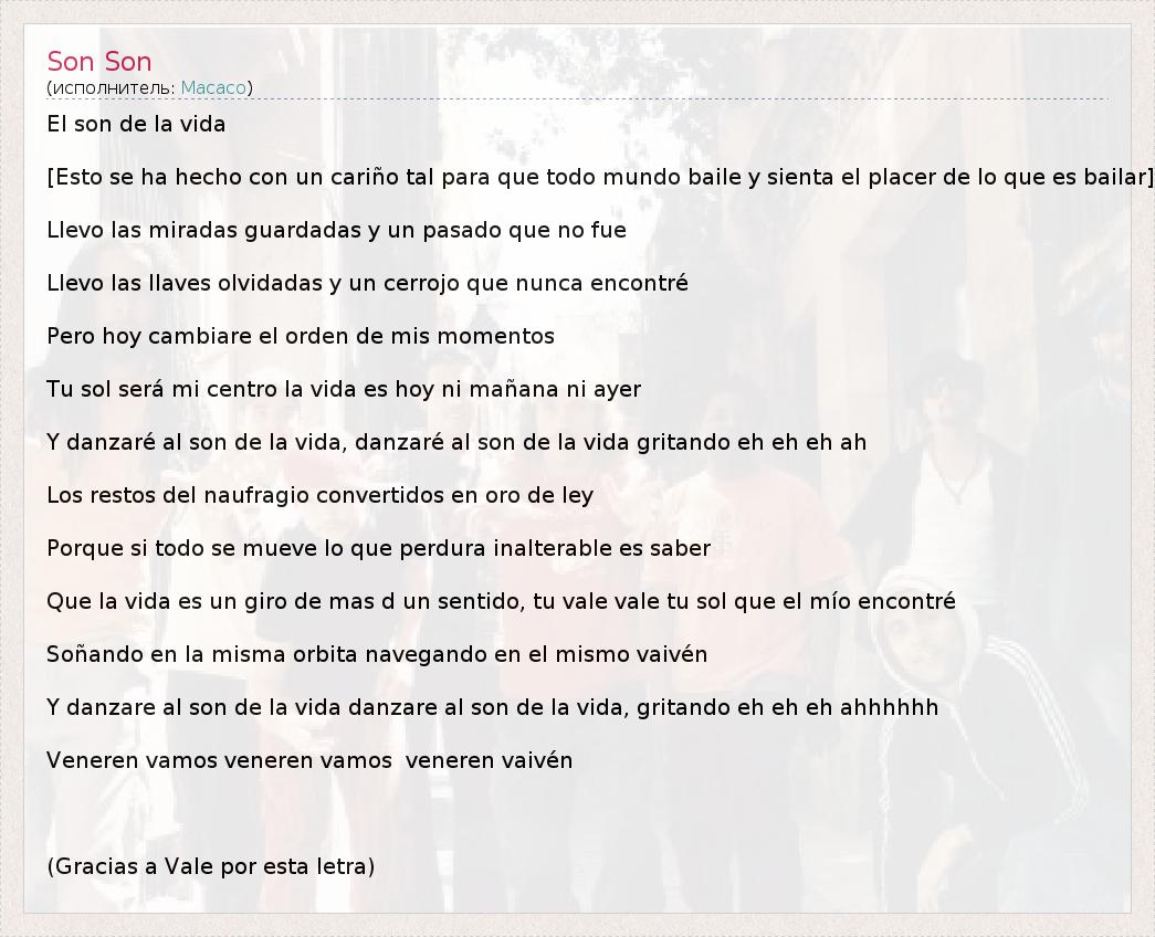 El son de la vida [Esto se ha hecho con un cariño tal para que todo mundo baile y sienta el placer de lo que es bailar] Llevo las miradas guardadas y un pasado que no fue Llevo las llaves olvidadas y un cerrojo que nunca encontré Pero hoy cambiare el orden de mis momentos Tu sol será mi centro la vida es hoy ni mañana ni ayer Y danzaré al son de la vida, danzaré al son de la vida gritando eh eh eh ah Los restos del naufragio convertidos en oro de ley Porque si todo se mueve lo que perdura inalterable es saber Que la vida es un giro de mas d un sentido, tu vale vale tu sol que el mío encontré Soñando en la misma orbita navegando en el mismo vaivén Y danzare al son de la vida danzare al son de la vida, gritando eh eh eh ahhhhhh Veneren vamos veneren vamos veneren vaivén (Gracias a Vale por esta letra)