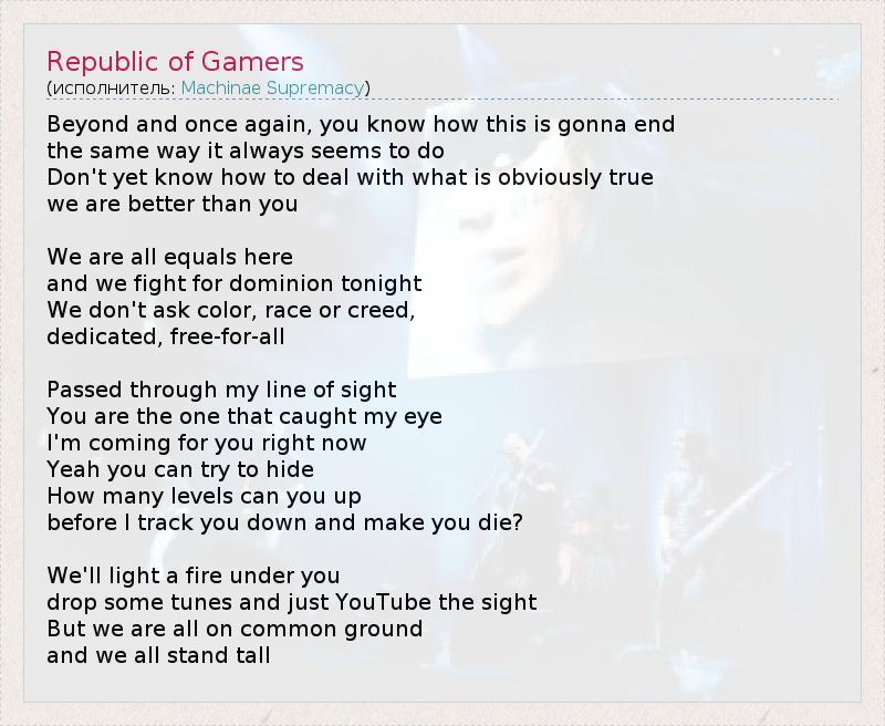 А как ты думаешь, о чем песня "Republic of Gamers" ?