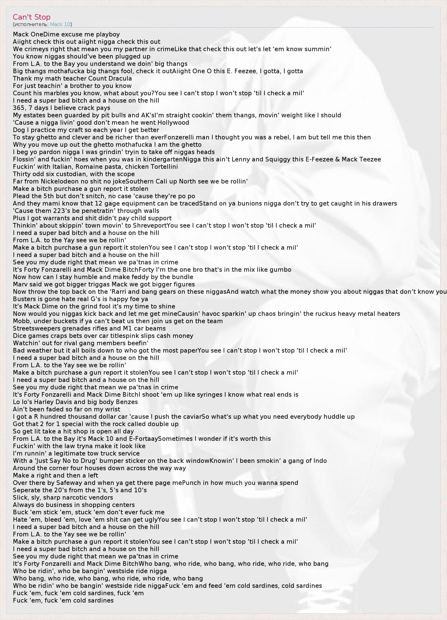 Это интересно:Когда западное побережье впервые забралось на вершины рэп индустрии в середине 90-ых годов, Mack 10 наряду с его давним партнером Айс Кьюбом, являлся одним из самых многообещающих талантов побережья. Оба Лос-анджелесских рэппера были соавторами композиции "Foe Life", ошеломляющий хит Мак Тэна, вышедший на альбоме "Mack 10" в 1995 году. Год спустя они объединяются с WC в группу под названием... продолжение