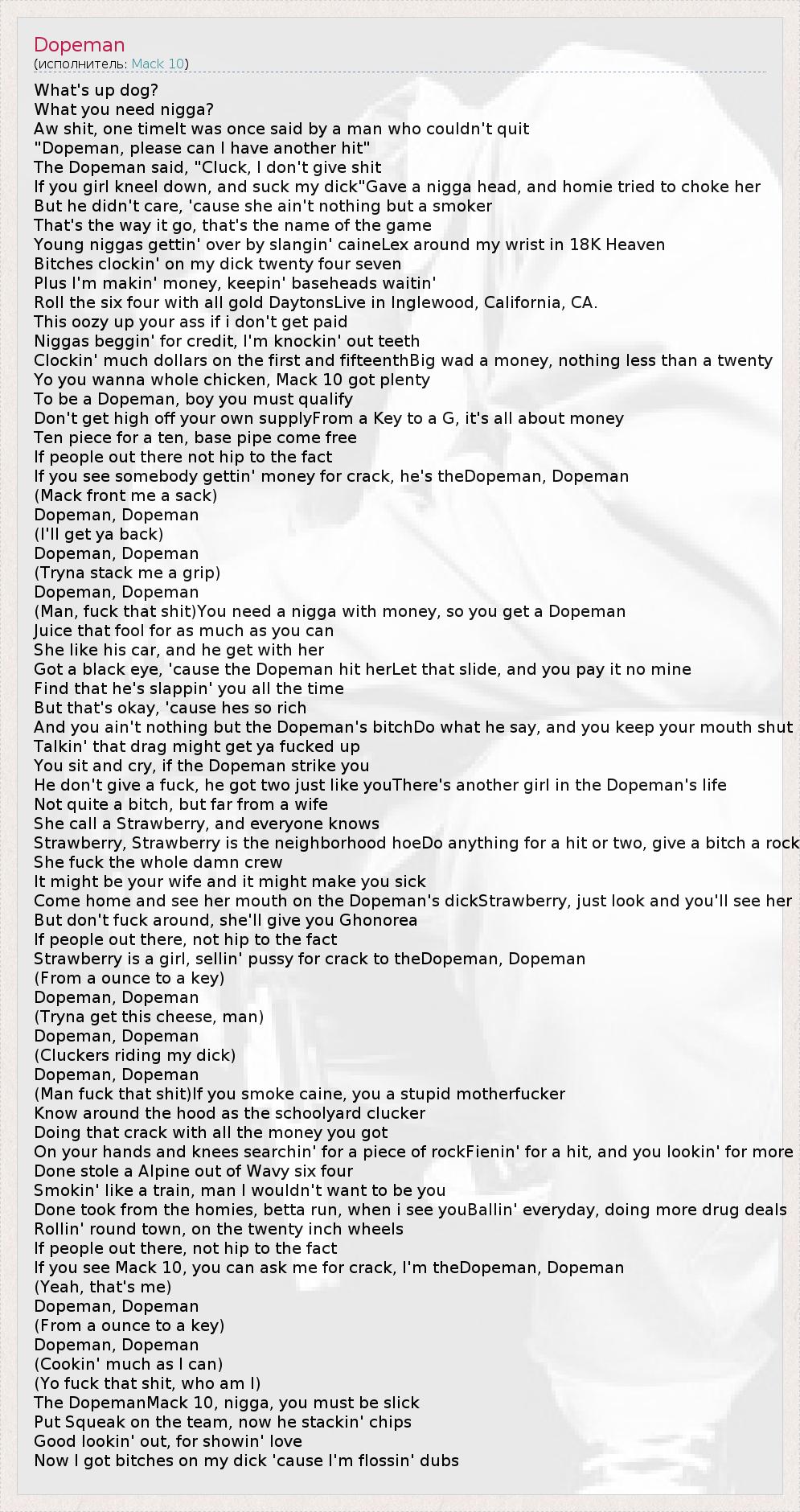 What's up dog? What you need nigga? Aw shit, one timeIt was once said by a man who couldn't quit "Dopeman, please can I have another hit" The Dopeman said, "Cluck, I don't give shit If you girl kneel down, and suck my dick"Gave a nigga head, and homie tried to choke her But he didn't care, 'cause she ain't nothing but a smoker That's the way it go, that's the name of the game Young niggas gettin' over by slangin' caineLex around my wrist in 18K Heaven Bitches clockin' on my dick twenty four seven Plus I'm makin' money, keepin' baseheads waitin' Roll the six four with all gold DaytonsLive in Inglewood, California, CA. This oozy up your ass if i don't get paid Niggas beggin' for credit, I'm knockin' out teeth Clockin' much dollars on the first and fifteenthBig wad a money, nothing less than a twenty Yo you wanna whole chicken, Mack 10 got plenty To be a Dopeman, boy you must qualify Don't get high off your own supplyFrom a Key to a G, it's all about money Ten piece for a ten, base pipe come free If people out there not hip to the fact If you see somebody gettin' money for crack, he's theDopeman, Dopeman (Mack front me a sack) Dopeman, Dopeman (I'll get ya back) Dopeman, Dopeman (Tryna stack me a grip) Dopeman, Dopeman (Man, fuck that shit)You need a nigga with money, so you get a Dopeman Juice that fool for as much as you can She like his car, and he get with her Got a black eye, 'cause the Dopeman hit herLet that slide, and you pay it no mine Find that he's slappin' you all the time But that's okay, 'cause hes so rich And you ain't nothing but the Dopeman's bitchDo what he say, and you keep your mouth shut Talkin' that drag might get ya fucked up You sit and cry, if the Dopeman strike you He don't give a fuck, he got two just like youThere's another girl in the Dopeman's life Not quite a bitch, but far from a wife She call a Strawberry, and everyone knows Strawberry, Strawberry is the neighborhood hoeDo anything for a hit or two, give a bitch a rock She fuck the whole damn crew It might be your wife and it might make you sick Come home and see her mouth on the Dopeman's dickStrawberry, just look and you'll see her But don't fuck around, she'll give you Ghonorea If people out there, not hip to the fact Strawberry is a girl, sellin' pussy for crack to theDopeman, Dopeman (From a ounce to a key) Dopeman, Dopeman (Tryna get this cheese, man) Dopeman, Dopeman (Cluckers riding my dick) Dopeman, Dopeman (Man fuck that shit)If you smoke caine, you a stupid motherfucker Know around the hood as the schoolyard clucker Doing that crack with all the money you got On your hands and knees searchin' for a piece of rockFienin' for a hit, and you lookin' for more Done stole a Alpine out of Wavy six four Smokin' like a train, man I wouldn't want to be you Done took from the homies, betta run, when i see youBallin' everyday, doing more drug deals Rollin' round town, on the twenty inch wheels If people out there, not hip to the fact If you see Mack 10, you can ask me for crack, I'm theDopeman, Dopeman (Yeah, that's me) Dopeman, Dopeman (From a ounce to a key) Dopeman, Dopeman (Cookin' much as I can) (Yo fuck that shit, who am I) The DopemanMack 10, nigga, you must be slick Put Squeak on the team, now he stackin' chips Good lookin' out, for showin' love Now I got bitches on my dick 'cause I'm flossin' dubs