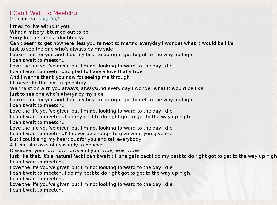 ГлавнаяИсполнителиMacy GrayI Can't Wait To Meetchu