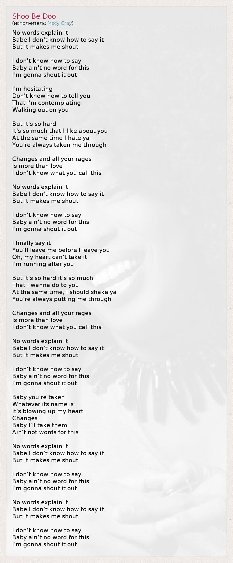 No words explain it Babe I don't know how to say it But it makes me shout I don't know how to say Baby ain't no word for this I'm gonna shout it out I'm hesitating Don't know how to tell you That I'm contemplating Walking out on you But it's so hard It's so much that I like about you At the same time I hate ya You're always taken me through Changes and all your rages Is more than love I don't know what you call this No words explain it Babe I don't know how to say it But it makes me shout I don't know how to say Baby ain't no word for this I'm gonna shout it out I finally say it You'll leave me before I leave you Oh, my heart can't take it I'm running after you But it's so hard it's so much That I wanna do to you At the same time, I should shake ya You're always putting me through Changes and all your rages Is more than love I don't know what you call this No words explain it Babe I don't know how to say it But it makes me shout I don't know how to say Baby ain't no word for this I'm gonna shout it out Baby you're taken Whatever its name is It's blowing up my heart Changes Baby I'll take them Ain't not words for this No words explain it Babe I don't know how to say it But it makes me shout I don't know how to say Baby ain't no word for this I'm gonna shout it out No words explain it Babe I don't know how to say it But it makes me shout I don't know how to say Baby ain't no word for this I'm gonna shout it out
