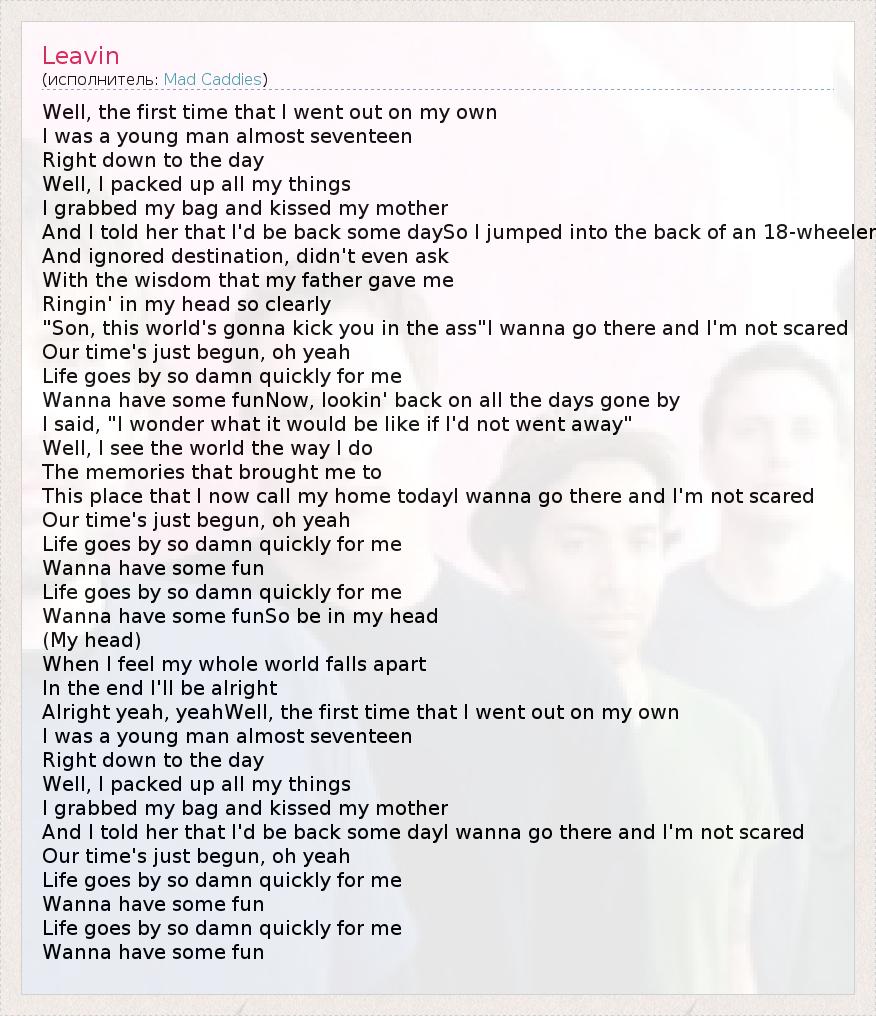 Well, the first time that I went out on my own I was a young man almost seventeen Right down to the day Well, I packed up all my things I grabbed my bag and kissed my mother And I told her that I'd be back some daySo I jumped into the back of an 18-wheeler And ignored destination, didn't even ask With the wisdom that my father gave me Ringin' in my head so clearly "Son, this world's gonna kick you in the ass"I wanna go there and I'm not scared Our time's just begun, oh yeah Life goes by so damn quickly for me Wanna have some funNow, lookin' back on all the days gone by I said, "I wonder what it would be like if I'd not went away" Well, I see the world the way I do The memories that brought me to This place that I now call my home todayI wanna go there and I'm not scared Our time's just begun, oh yeah Life goes by so damn quickly for me Wanna have some fun Life goes by so damn quickly for me Wanna have some funSo be in my head (My head) When I feel my whole world falls apart In the end I'll be alright Alright yeah, yeahWell, the first time that I went out on my own I was a young man almost seventeen Right down to the day Well, I packed up all my things I grabbed my bag and kissed my mother And I told her that I'd be back some dayI wanna go there and I'm not scared Our time's just begun, oh yeah Life goes by so damn quickly for me Wanna have some fun Life goes by so damn quickly for me Wanna have some fun