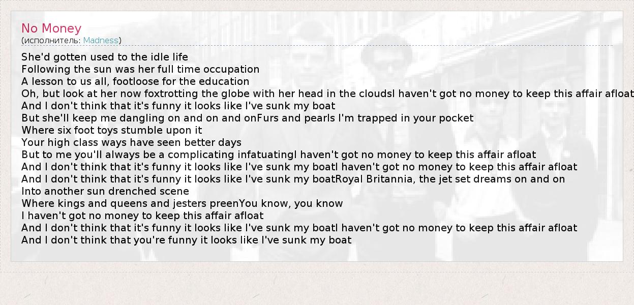 She'd gotten used to the idle life Following the sun was her full time occupation A lesson to us all, footloose for the education Oh, but look at her now foxtrotting the globe with her head in the cloudsI haven't got no money to keep this affair afloat And I don't think that it's funny it looks like I've sunk my boat But she'll keep me dangling on and on and onFurs and pearls I'm trapped in your pocket Where six foot toys stumble upon it Your high class ways have seen better days But to me you'll always be a complicating infatuatingI haven't got no money to keep this affair afloat And I don't think that it's funny it looks like I've sunk my boatI haven't got no money to keep this affair afloat And I don't think that it's funny it looks like I've sunk my boatRoyal Britannia, the jet set dreams on and on Into another sun drenched scene Where kings and queens and jesters preenYou know, you know I haven't got no money to keep this affair afloat And I don't think that it's funny it looks like I've sunk my boatI haven't got no money to keep this affair afloat And I don't think that you're funny it looks like I've sunk my boat