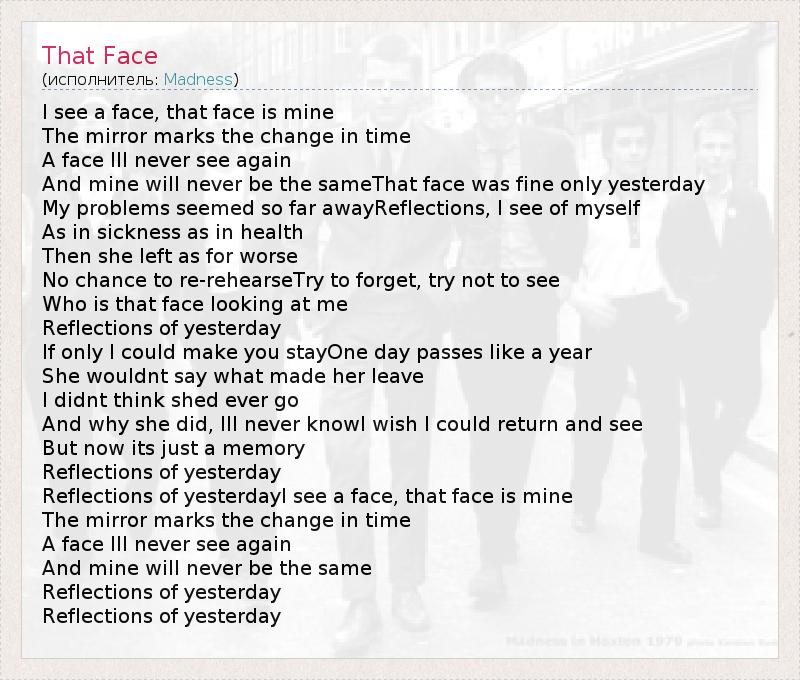 I see a face, that face is mine The mirror marks the change in time A face Ill never see again And mine will never be the sameThat face was fine only yesterday My problems seemed so far awayReflections, I see of myself As in sickness as in health Then she left as for worse No chance to re-rehearseTry to forget, try not to see Who is that face looking at me Reflections of yesterday If only I could make you stayOne day passes like a year She wouldnt say what made her leave I didnt think shed ever go And why she did, Ill never knowI wish I could return and see But now its just a memory Reflections of yesterday Reflections of yesterdayI see a face, that face is mine The mirror marks the change in time A face Ill never see again And mine will never be the same Reflections of yesterday Reflections of yesterday