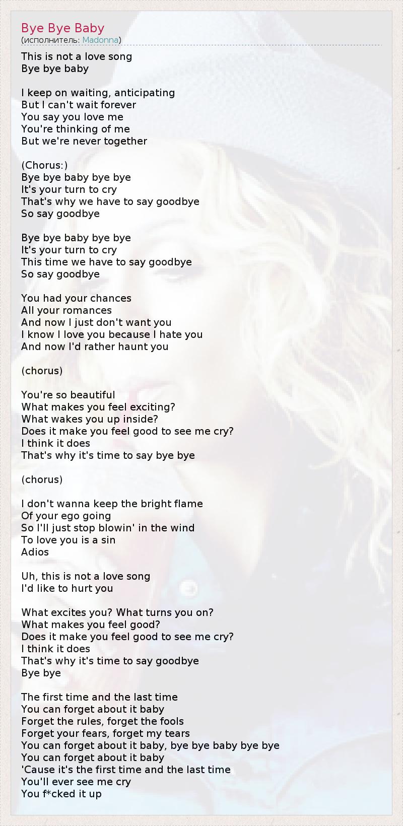 Это песня не о любви, Пока, пока, малыш. Я продолжаю ждать, находясь в предвкушении, Но я не могу ждать вечно. Говоришь, что любишь меня, Думаешь обо мне, Но мы никогда не бываем вместе. (Припев:) Пока, пока, малыш, пока, пока, Твоя очередь плакать, Вот почему мы должны сказать "прощай", Так скажи "прощай". Пока, пока, малыш, пока, пока, Твоя очередь плакать, Вот почему мы должны сказать "прощай", Так скажи "прощай". У тебя были все шансы, Все твои романы, А теперь я просто не хочу тебя. Я знаю, что люблю тебя, потому что я ненавижу тебя, А теперь я лучше поохочусь на тебя. (припев) Ты так прекрасен. Что тебя так возбуждает? Что пробуждает тебя изнутри? Тебе приятно видеть, как я плачу? Думаю, да. Вот почему пора сказать: "Пока, пока!" (припев) Я не хочу оберегать яркое пламя Твоего нарастающего эгоизма, Поэтому я просто перестану его раздувать. Любить тебя - это грех. Прощай. Ах, это песня не о любви, Я бы хотела причинить тебе боль. Что тебя возбуждает? Что тебя заводит? Что тебе нравится? Тебе приятно видеть, как я плачу? Думаю, да. Вот почему пора сказать: "Пока, пока!" Пока, пока. В первый и последний раз Ты можешь забыть об этом, малыш. Забудь правила, забудь глупцов, Забудь свои страхи, забудь мои слезы. Можешь забыть об этом, малыш, пока, пока, малыш, пока, пока. Можешь забыть об этом, малыш, Потому что в первый и последний раз Ты увидишь, как я плачу. Из-за тебя!