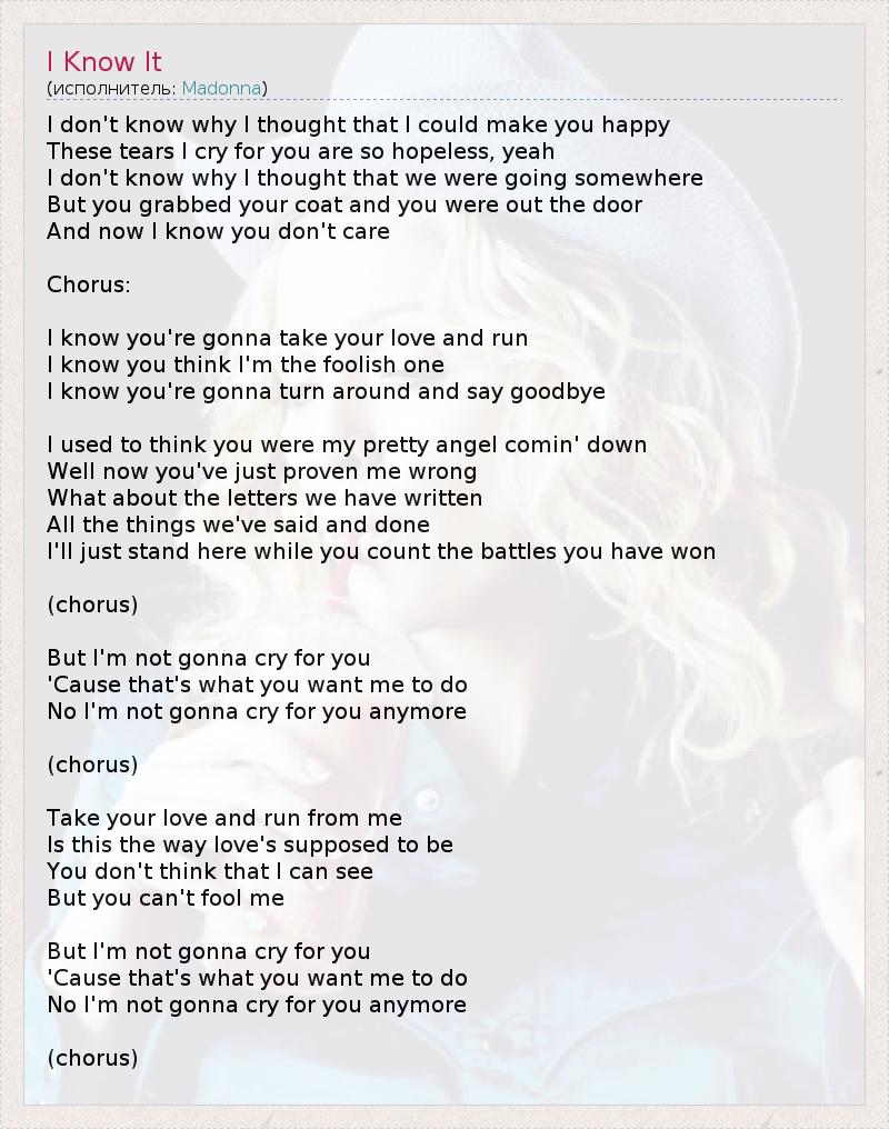 Я знаю это Не знаю почему, но я думала, что ты сможешь сделать меня счастливой Я плакала от безысходности Не знаю почему, но я думала, что мы придем к чему то Но ты схватил пальто и ушел И я знаю, что тебе все равно Я знаю, что ты заберешь свою любовь и сбежишь Я знаю, ты считаешь меня глупой Я знаю, ты все изменишь и забудешь меня Раньше я думала, что ты мой ангел, спустившийся с небес Сейчас ты доказал мне обратное Как насчет всего, что ты мне писал? Всего того, что между нами было? Я просто подожду, пока ты сосчитаешь свои победы Но я не буду из-за тебя плакать Потому что этого ты ждешь от меня Я больше не буду плакать из-за тебя Забирай свою любовь и катись Вот как выглядит твоя любовь Ты думаешь я не поняла Но тебе не обмануть меня Но я не буду из-за тебя плакать Потому что этого ты ждешь от меня Я больше не буду плакать из-за тебя
